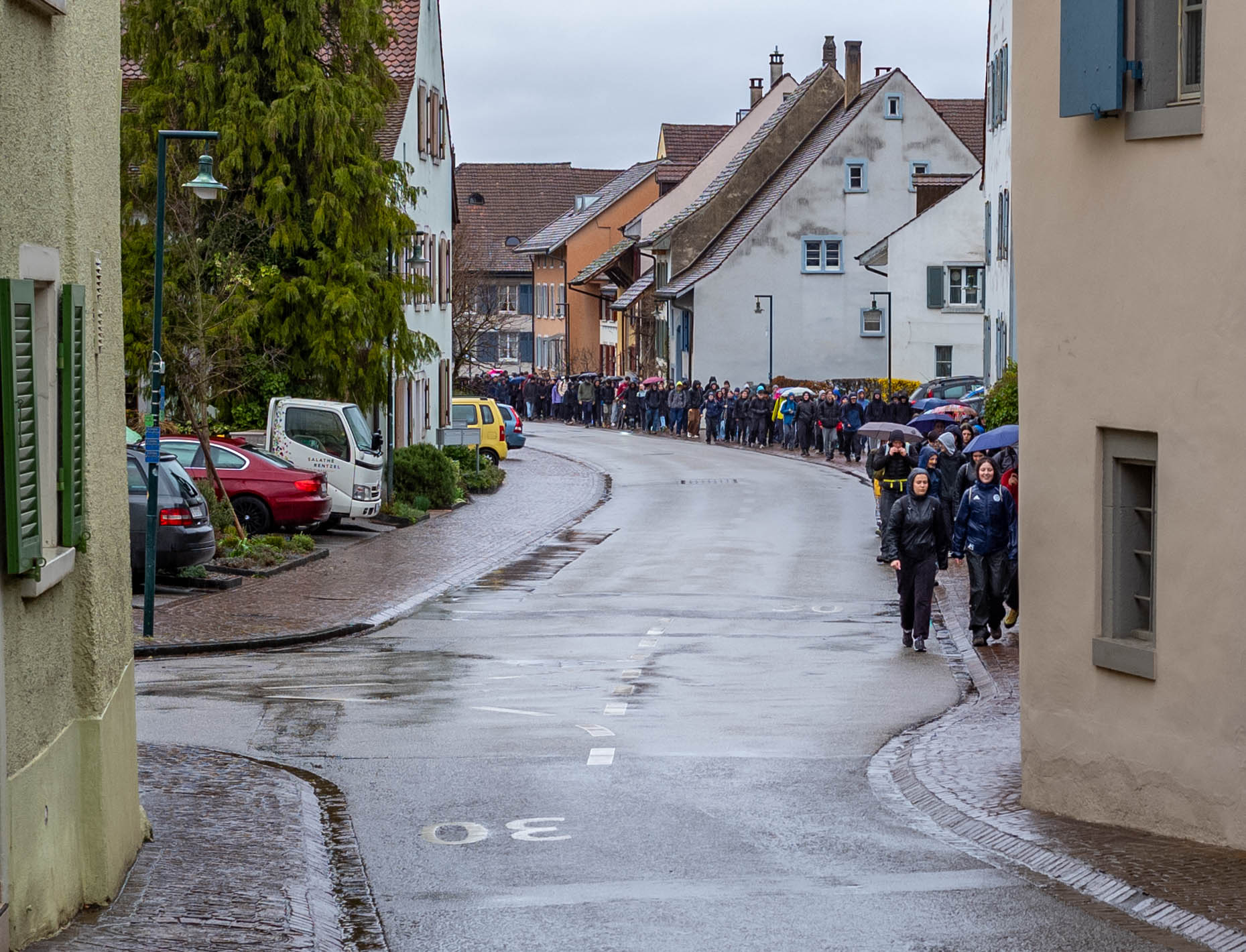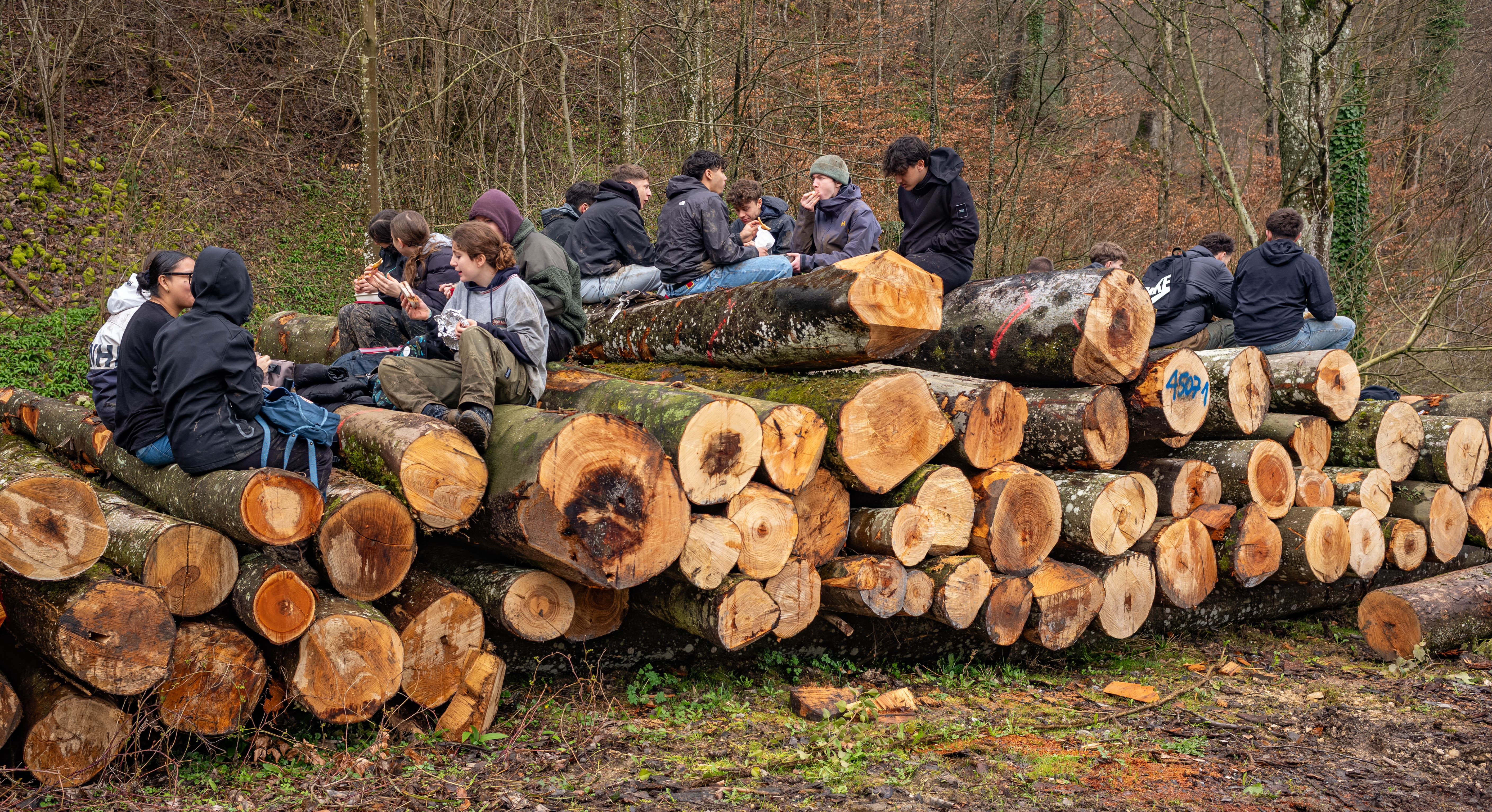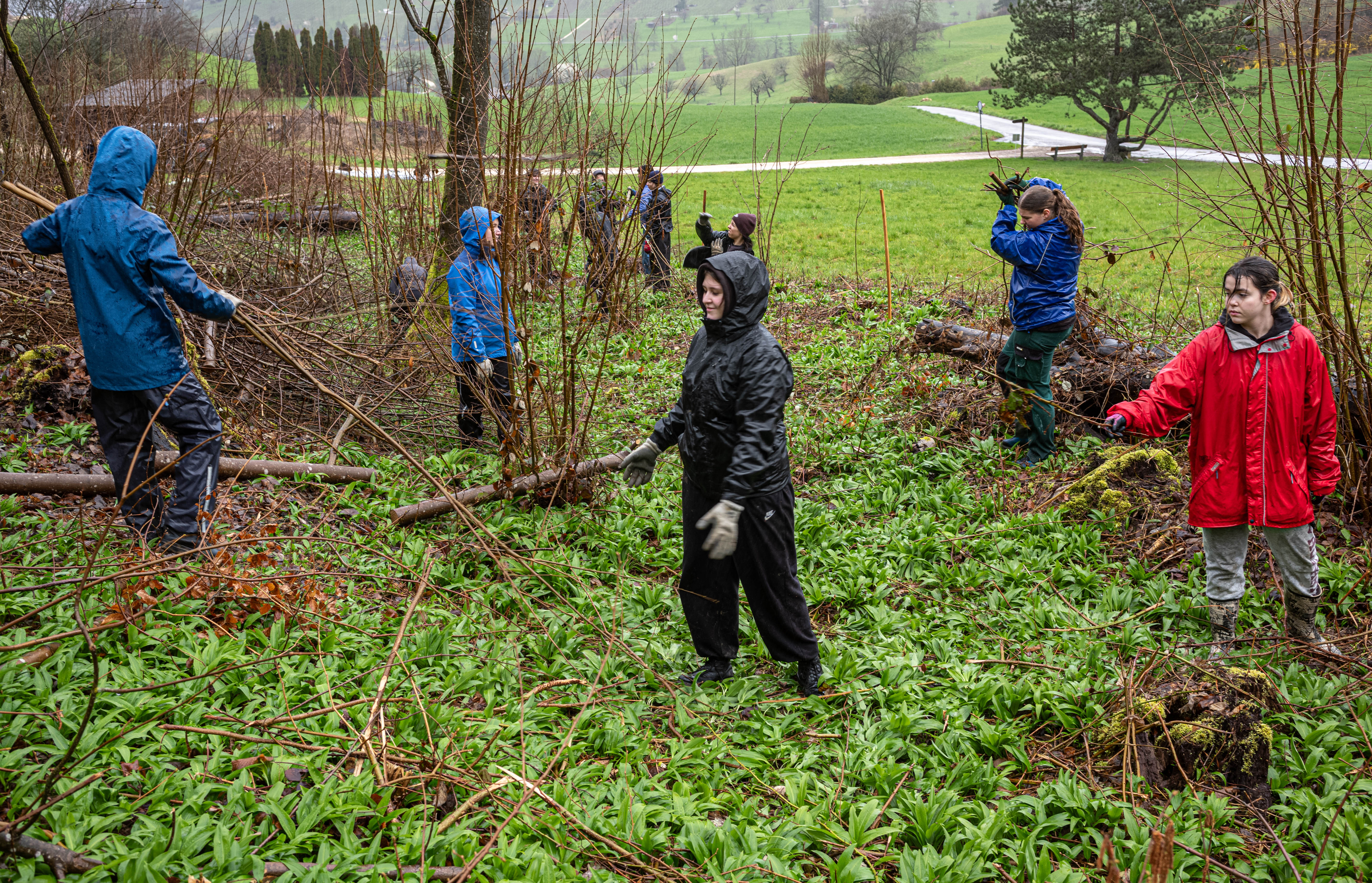 «Hilfe – meine Mascara ist total verschmiert!» Am Startpunkt unserer Arbeiten im Muttenzer Wald sahen viele schon aus, als hätten sie den ganzen Tag gearbeitet. Der Spaziergang von der Muttenzer Dorfkirche zum Einsatzort fand in strömendem Regen statt. Als alle an Posten 3 angekommen waren, begrüsste der Leiter des Forstreviers Schauenburg, Markus Eichenberger, die Schüler:innen mit den Worten „Heute erlebt ihr, was es heisst, draussen zu arbeiten!“ und: „Wer rumsteht, wird frieren, wer tatkräftig anpackt nicht. Ihr entscheidet selbst!“