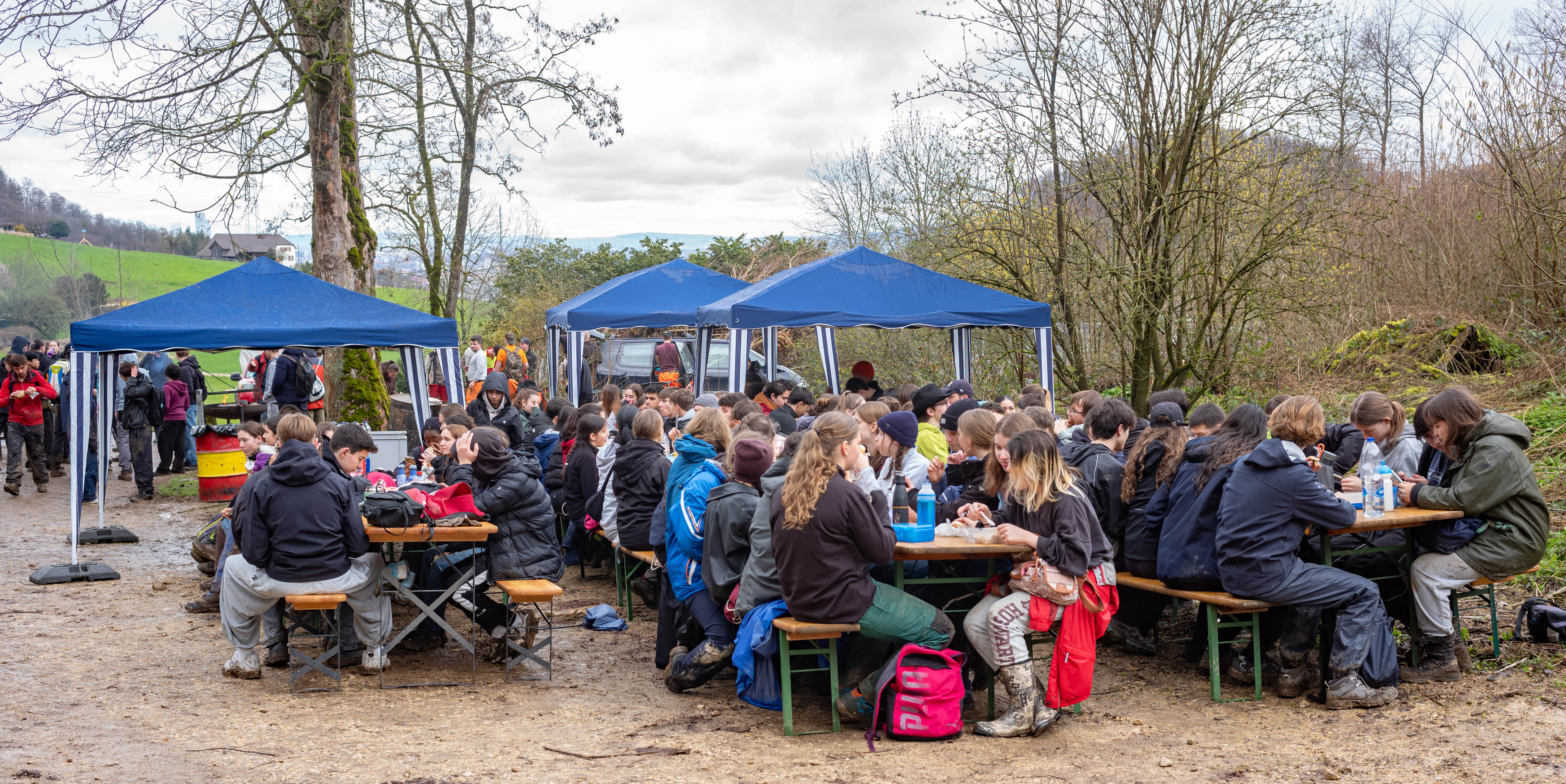 Bereits im November 2022 hatten alle Schüler:innen anlässlich des 50. Geburtstags unserer Schule auf der Rütihard Hecken angelegt und Bäume gepflanzt. Diese Aktion fand bei allen Beteiligten grossen Anklang. Daher setzte sich das Organisationsteam zum Ziel, einen solchen «Waldtag» im Schulcurriculum aller Erstklässler:innen zu etablieren. Folglich verbrachten die neuen Klassen des Gymnasiums und der FMS Muttenz den 13. März im Wald arbeitend. Doch schon im Vorfeld boten die Wetterprognosen ein Wechselbad der Gefühle. Mal war Sonnenschein, mal war Gewitter angesagt, nun war starker Regen bittere Realität.