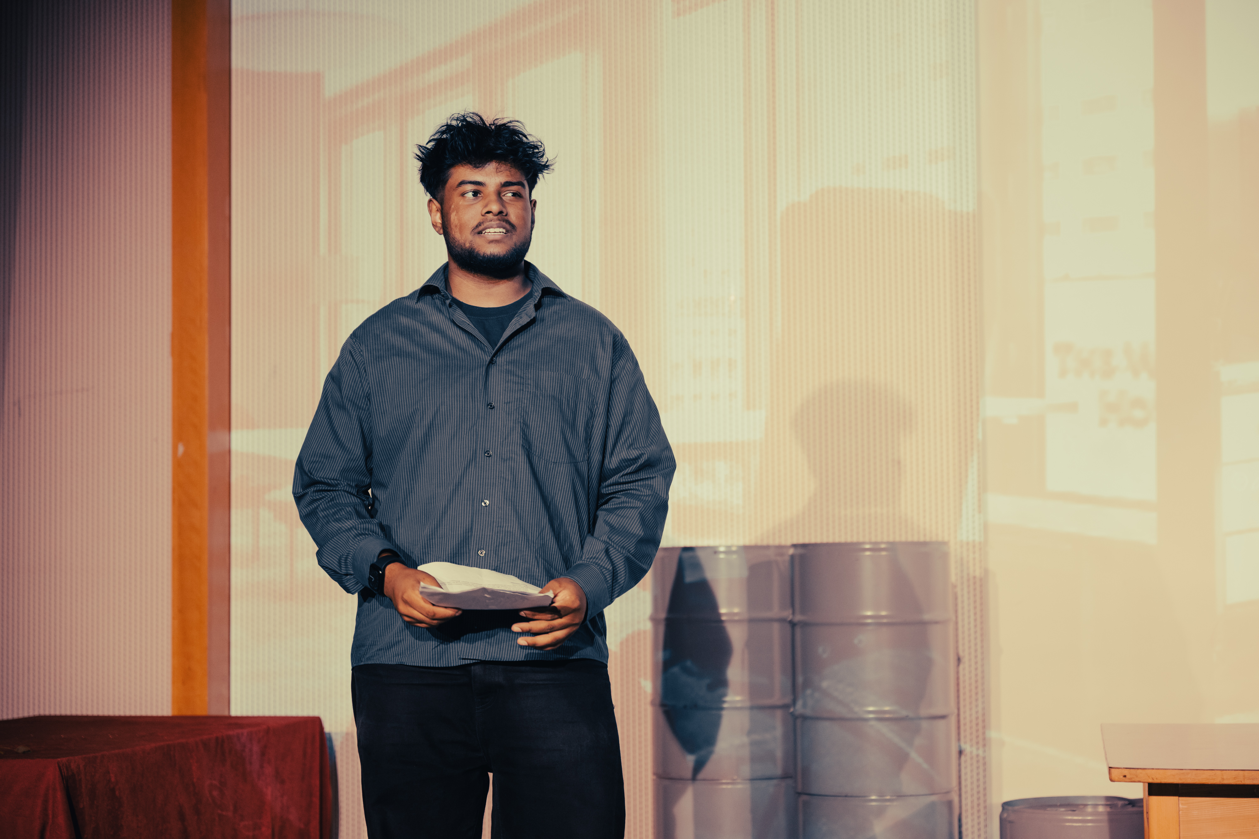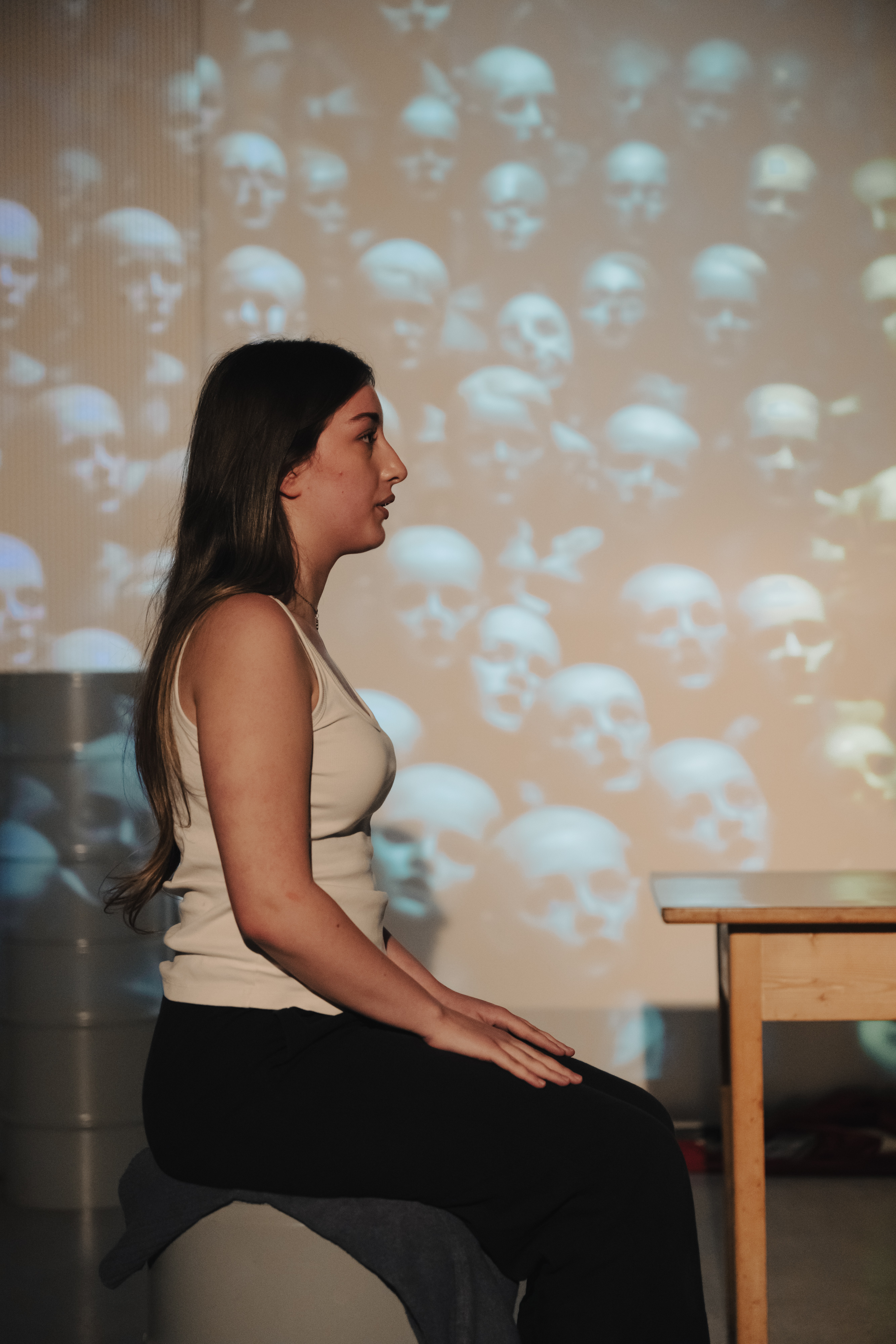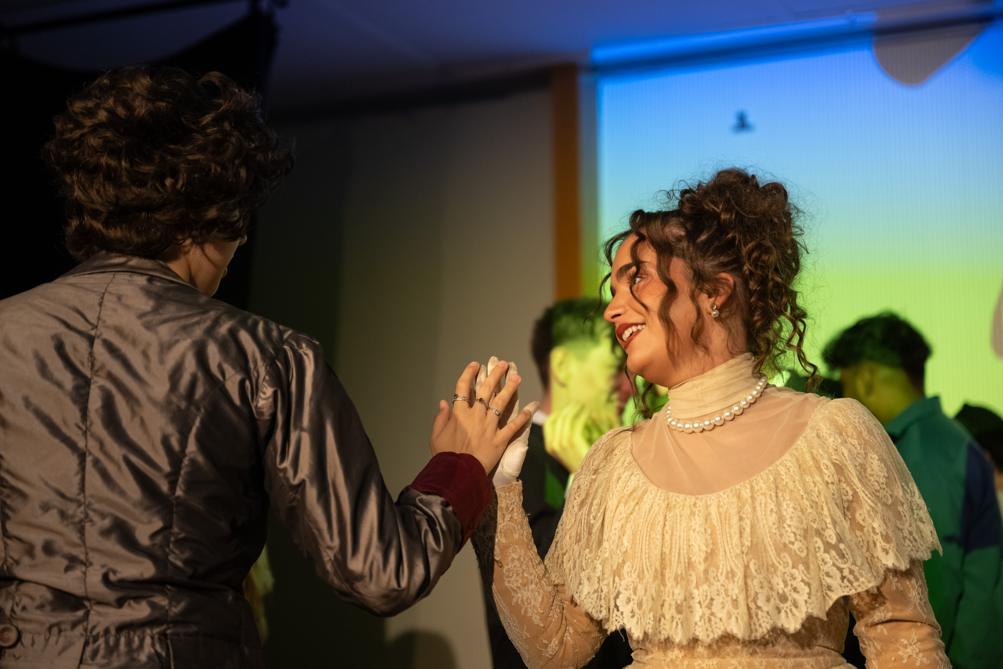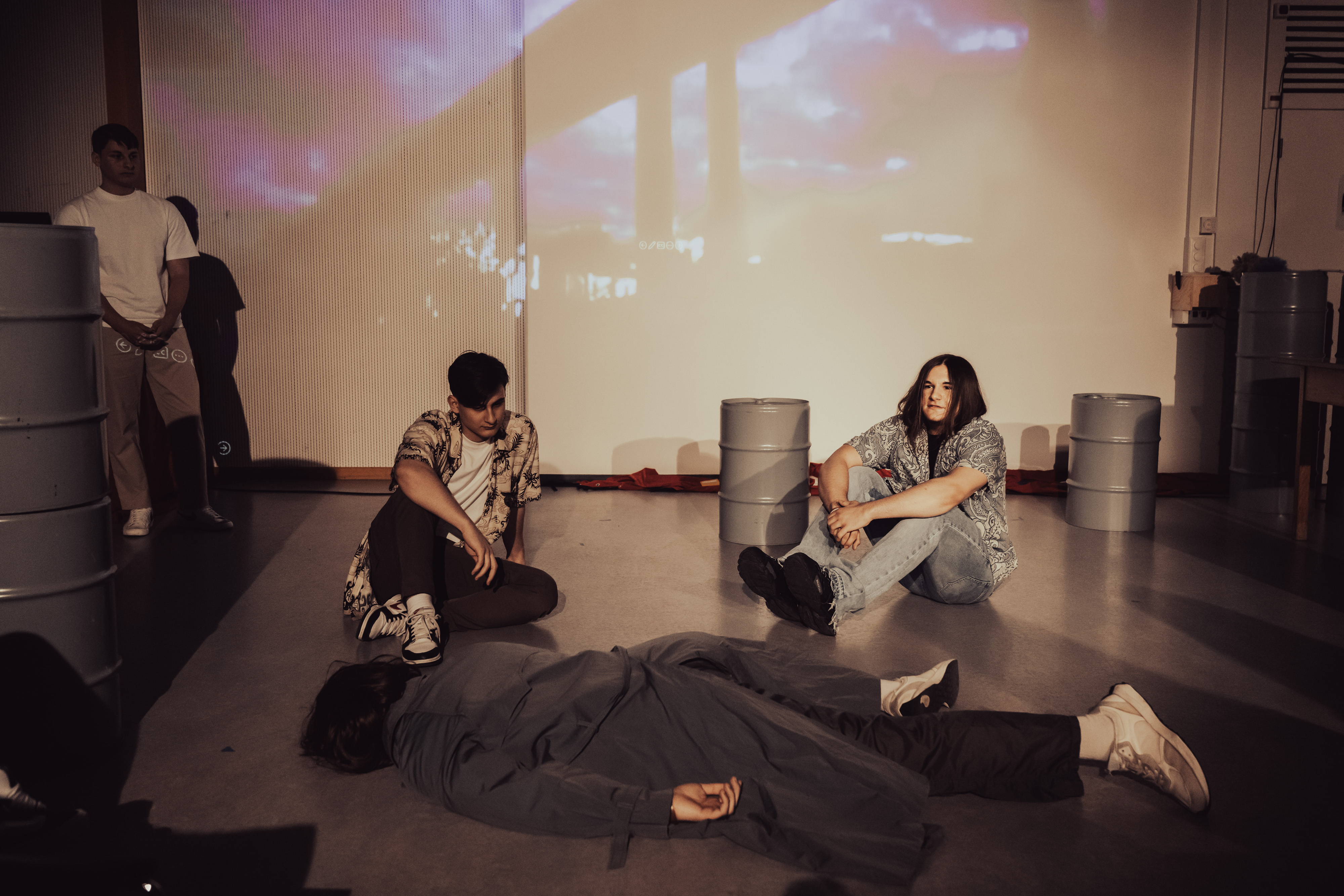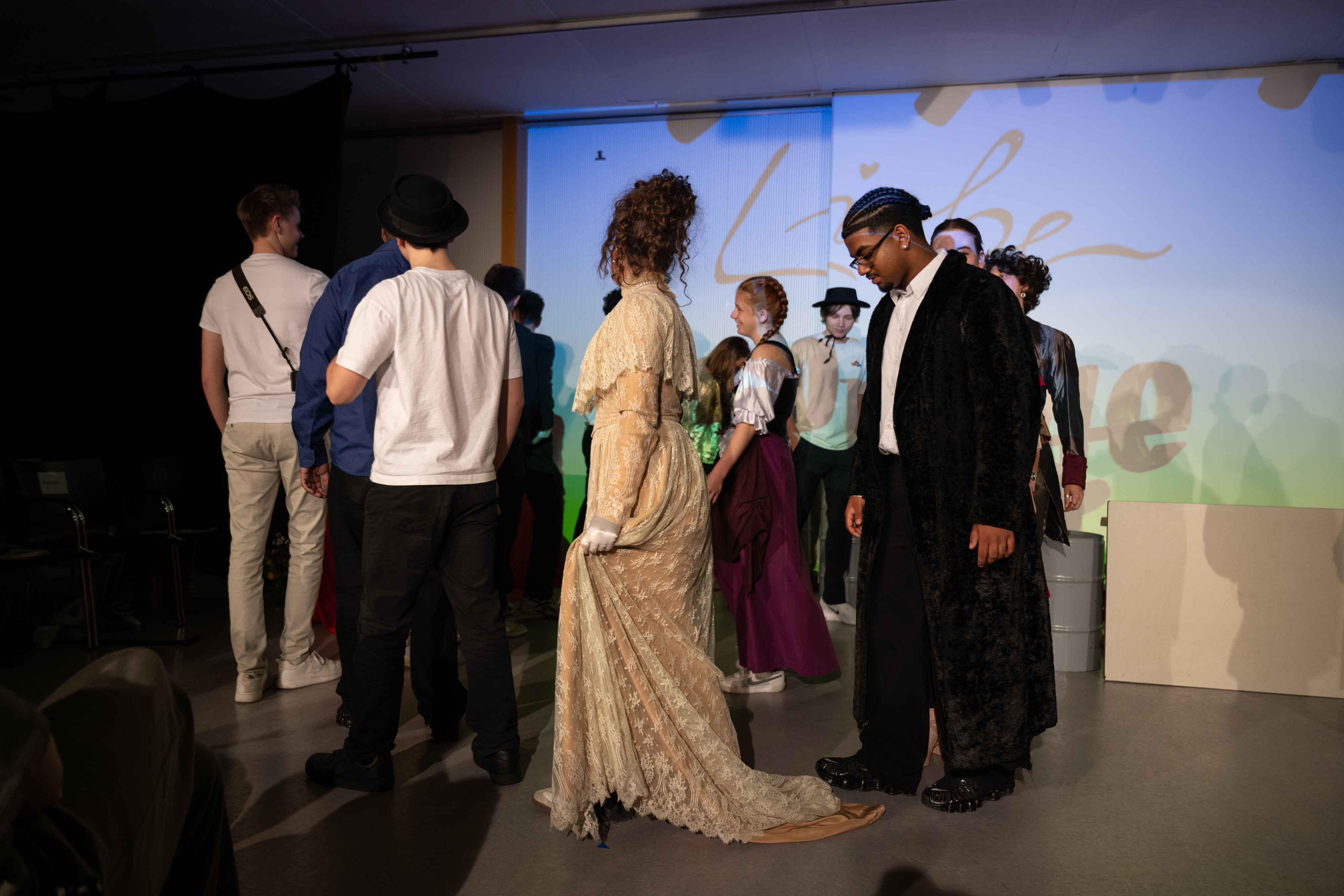 Es war kurz vor halb eins. Dutzende Zuschauer:innen strömten in das bestuhlte Foyer. Einige stillten noch hastig ihren Hunger, bevor die Vorstellung begann. Einige der Stühle waren reserviert. Daran hingen Schilder mit der Aufschrift «Klasse F2a» und «Klasse F2e». Hier sassen die Schauspieler:innen, die einen gekleidet in Anzügen, die anderen in altmodischen Ballkleidern, wieder andere in Alltagskleidung. Als alle aufstanden und auf der Bühne herumgingen, erinnerte die Szene an eine Party, was durch die laute Musik noch stärker unterstrichen wurde.