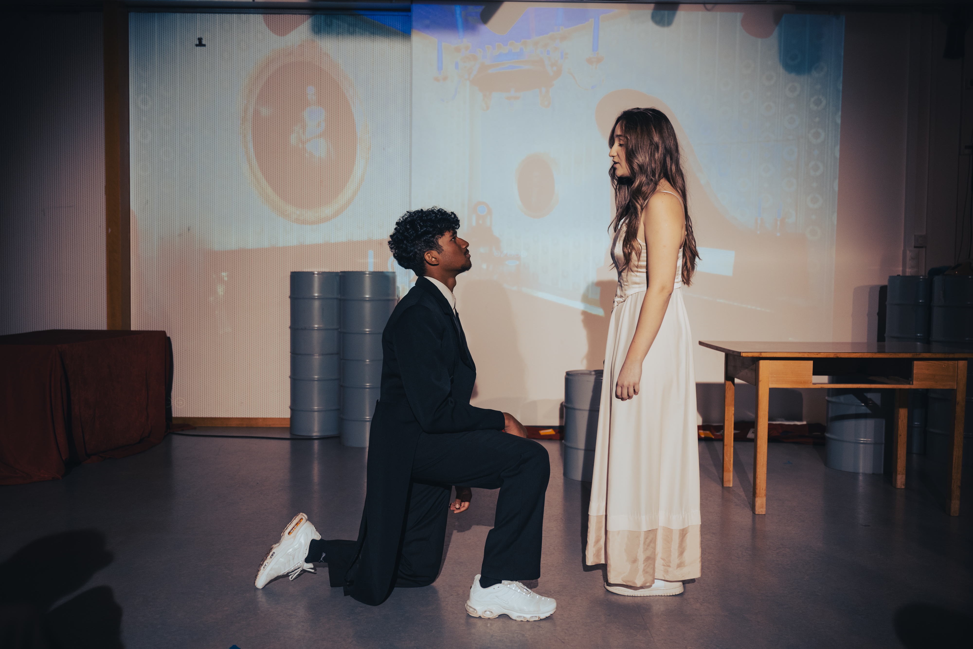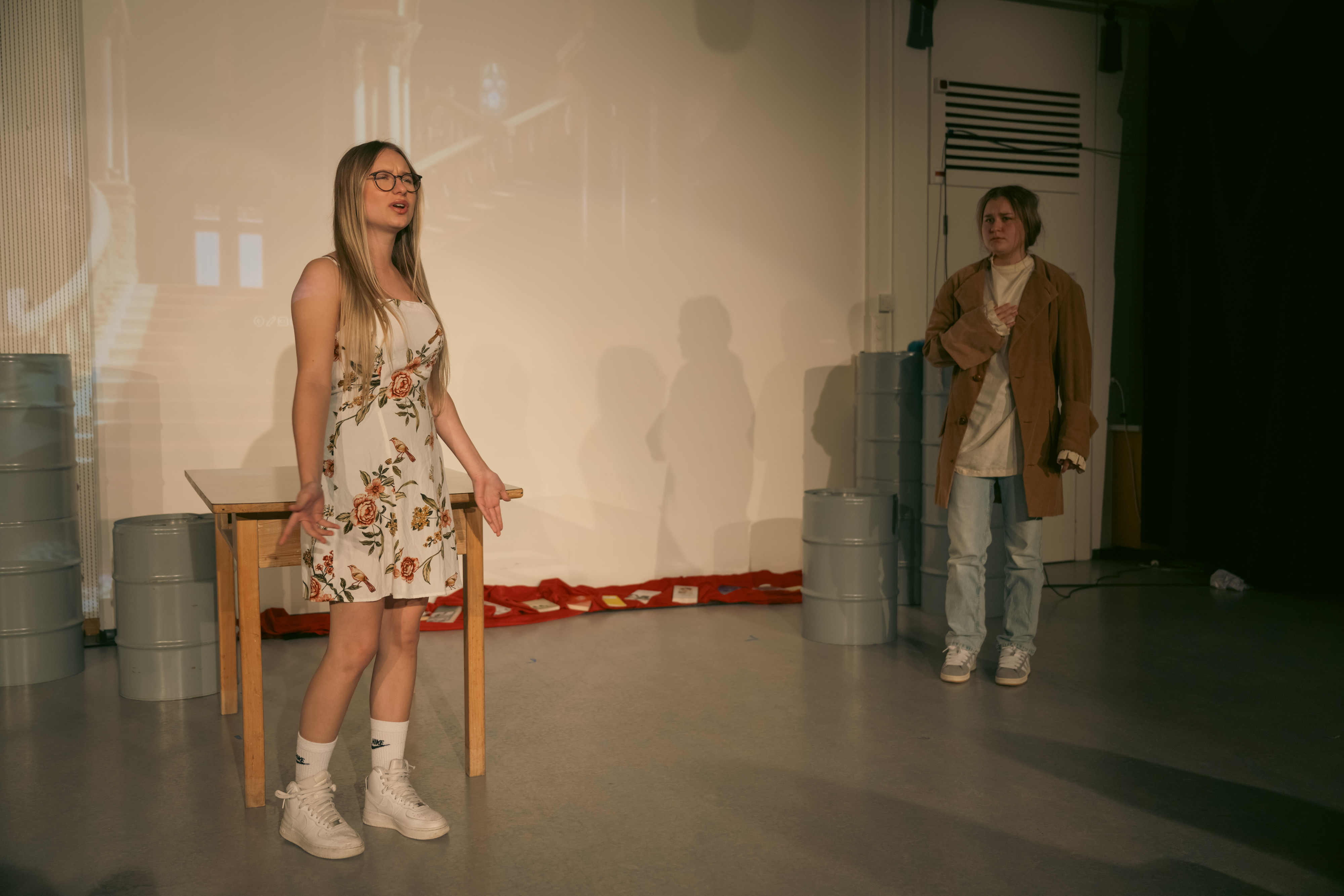 Insgesamt wurde in 13 kleinen Inszenierungen verschiedenste Literatur vorgestellt und zusammengefasst, wobei es in allen Geschichten um jegliche Art von tragischer Liebe ging. Das Bühnenbild des Theaters war sehr minimalistisch gestaltet, was ihm jedoch einen Charme gab. Mehr als einen Tisch, einige Metallfässer und eine Projektion auf der Wand gab es nicht, was die Aufmerksamkeit der Zuschauer völlig auf die dargestellten Geschichten lenkte. Die beiden Klassen dachten sich eine kreative und effiziente Art aus, dass alle zusammen auf der Bühne stehen konnten. Die Schüler:innen teilten sich teilweise die Rollen.