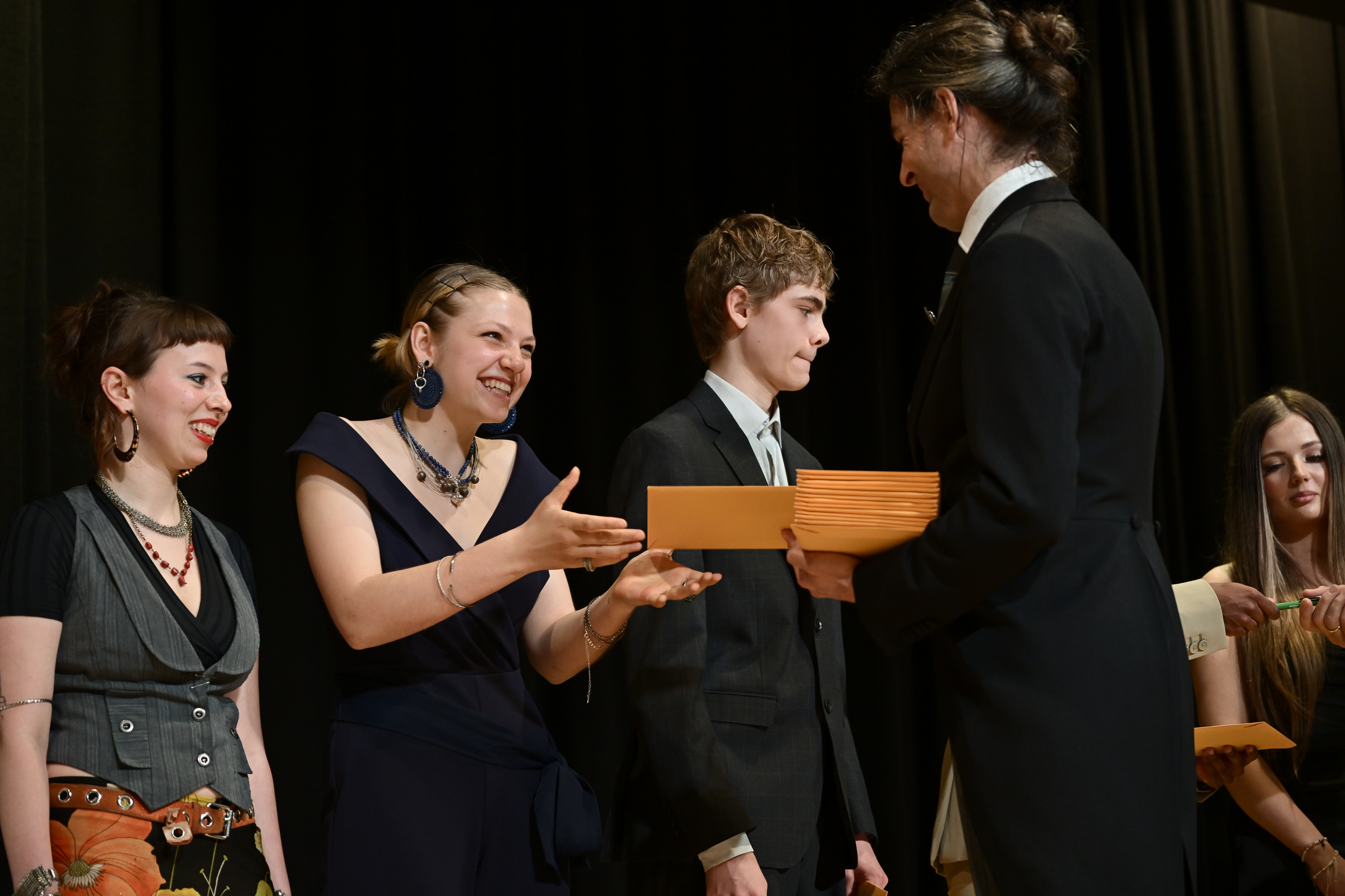 Im gelben Umschlag ist es drin: das rote Maturazeugnis des Kantons Basel-Landschaft. 6 Klassenlehrpersonen des Gymnasiums Muttenz haben es am 21.6.2024 im Kultur- und Sportzentrum Pratteln an 96 Maturand*innen überreicht. Dieses Jahr steht darin insgesamt 48 mal die Note 6 und 246 mal die Note 5.5 bei einer Gesamtzahl von 1413 Noten. Diese kamen zustande durch die Verrechnung von 980 Abschlussprüfungsnoten mit rund 5850 Prüfungen im Unterricht, wenn wir davon ausgehen, dass jedes Fach im Abschlussjahr 5 Noten produziert hat. Fotos: Adrian Marbacher und Daniel Nussbaumer