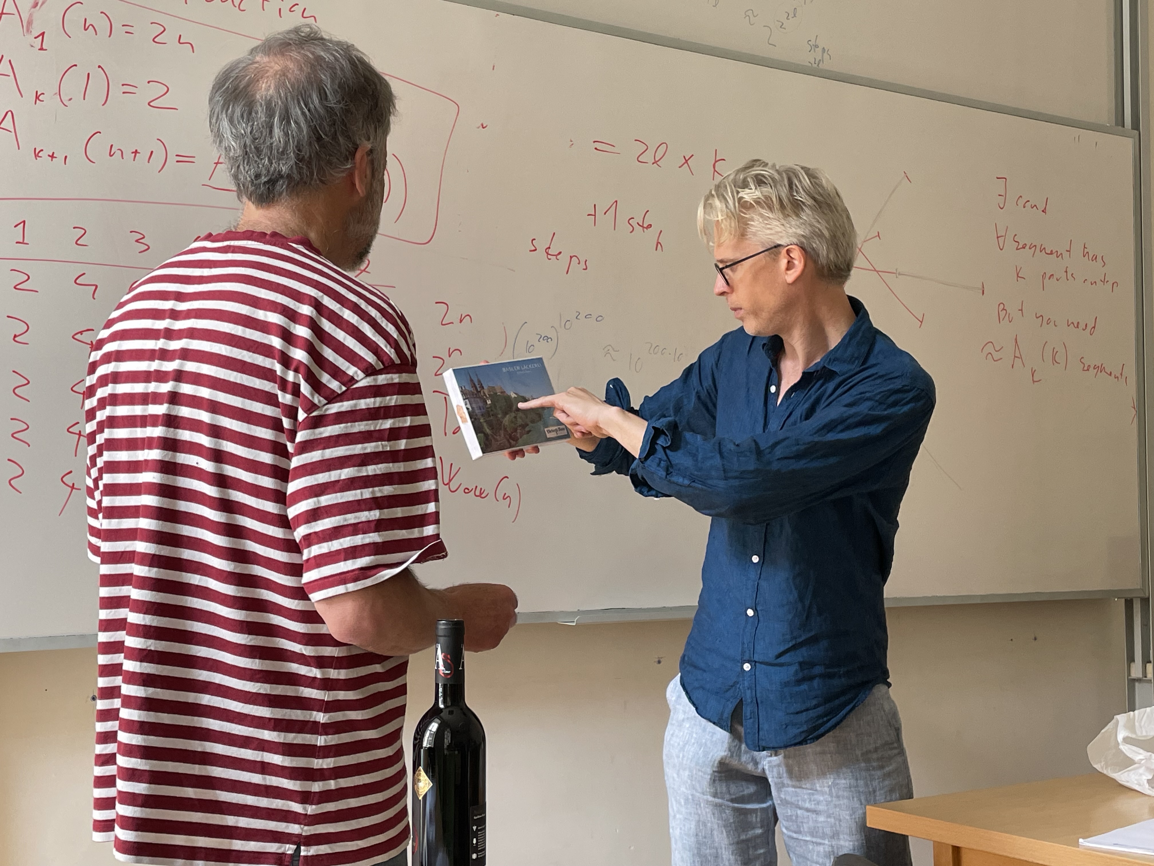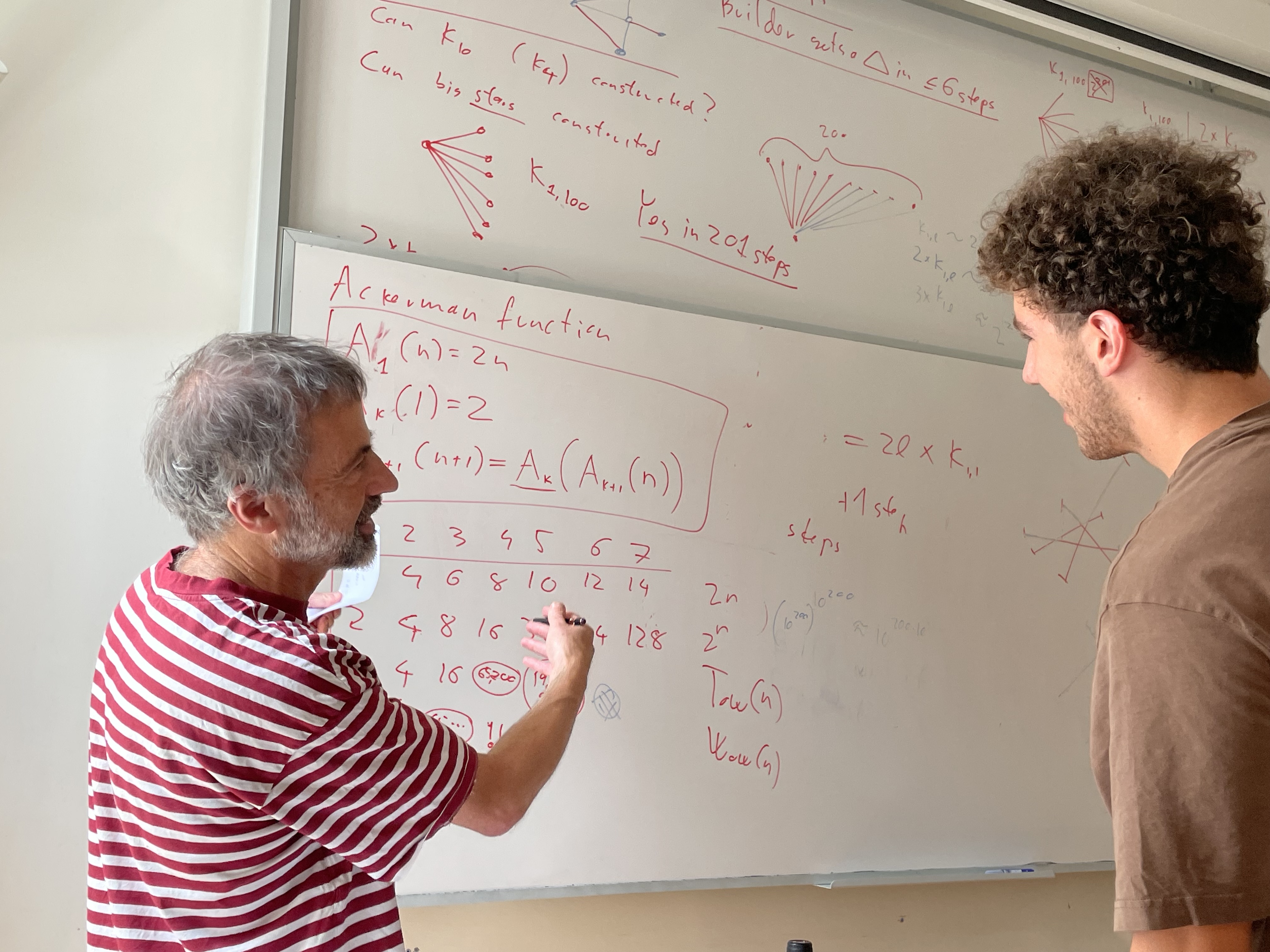 In einem Seminarraum des Instituts erzählte Tardos über ein Problem aus der Graphentheorie. Es begann mit einem einfachen Problem über eine Anzahl von Punkten, die durch rote und blaue Kanten verbunden sind. Tardos erweiterte das Problem, bis wir es irgendwann mit erstaunlich grossen und unfassbaren Zahlen zu tun hatten. Die sogenannte Ackermannsfunktion kam ins Spiel – eine Funktion, die noch viel schneller als exponentiell wächst. Tardos Vorlesung machte klar, dass Mathematik nicht nur nützlich, sondern auch unglaublich faszinierend – und ja, manchmal auch ein bisschen verrückt sein kann.