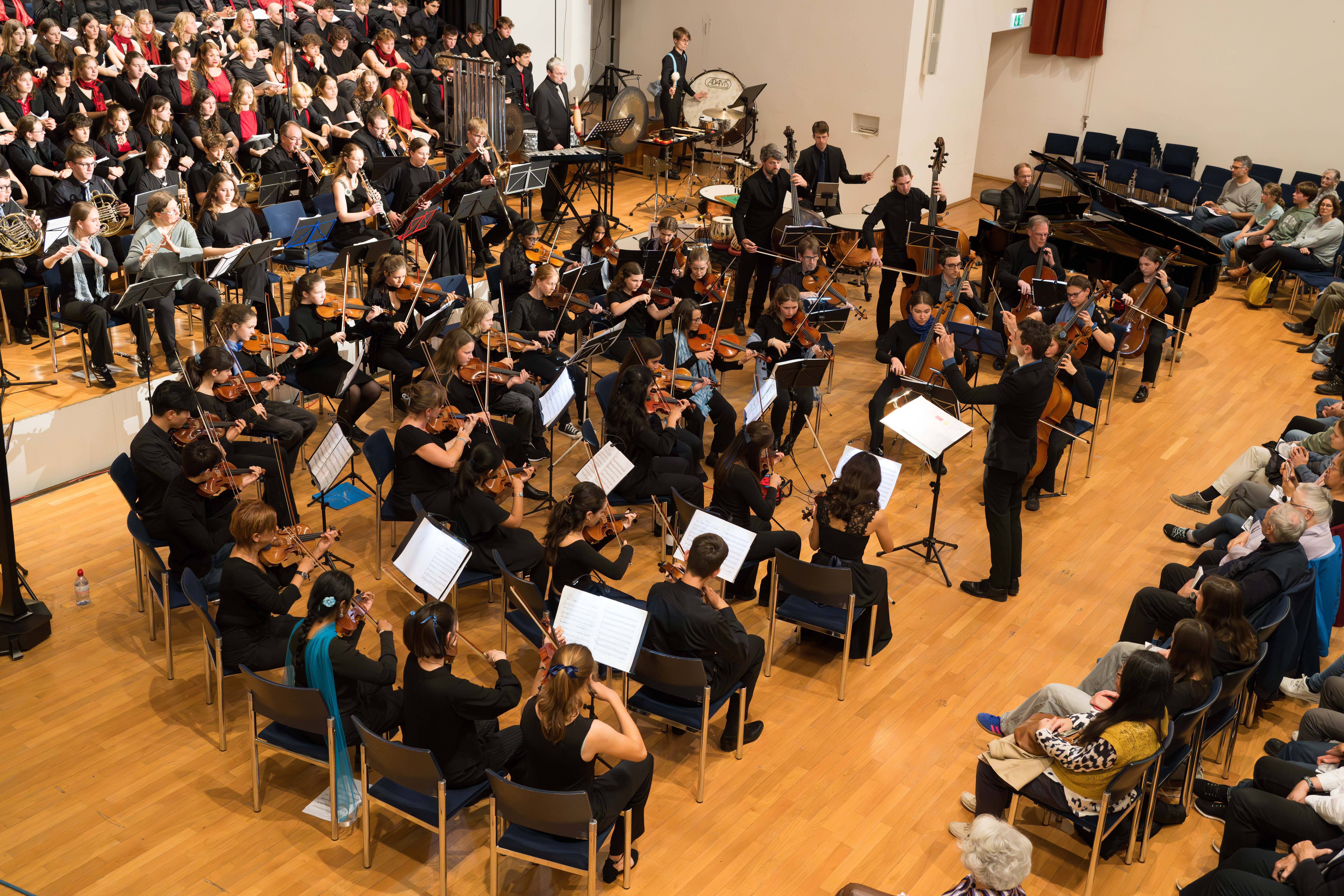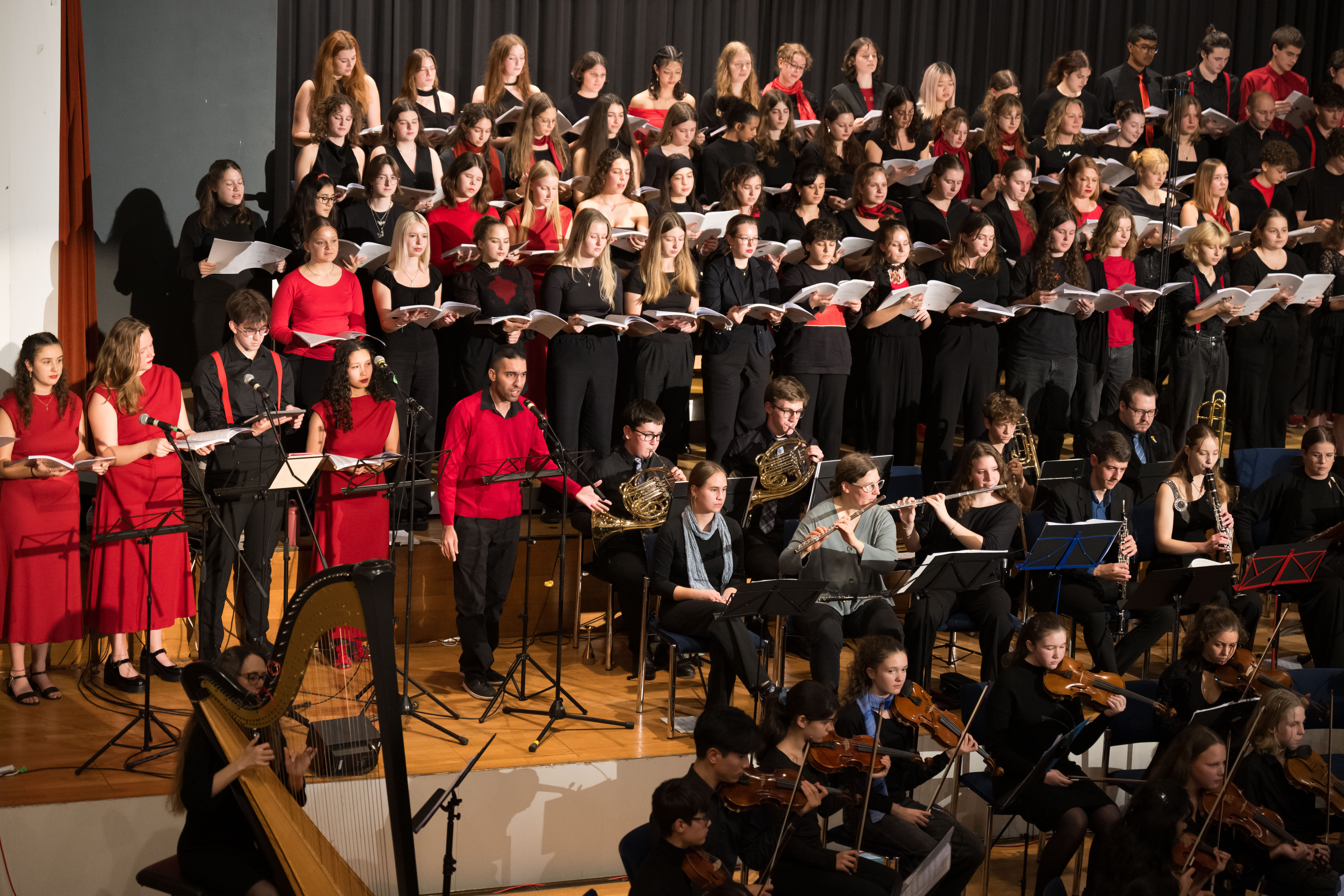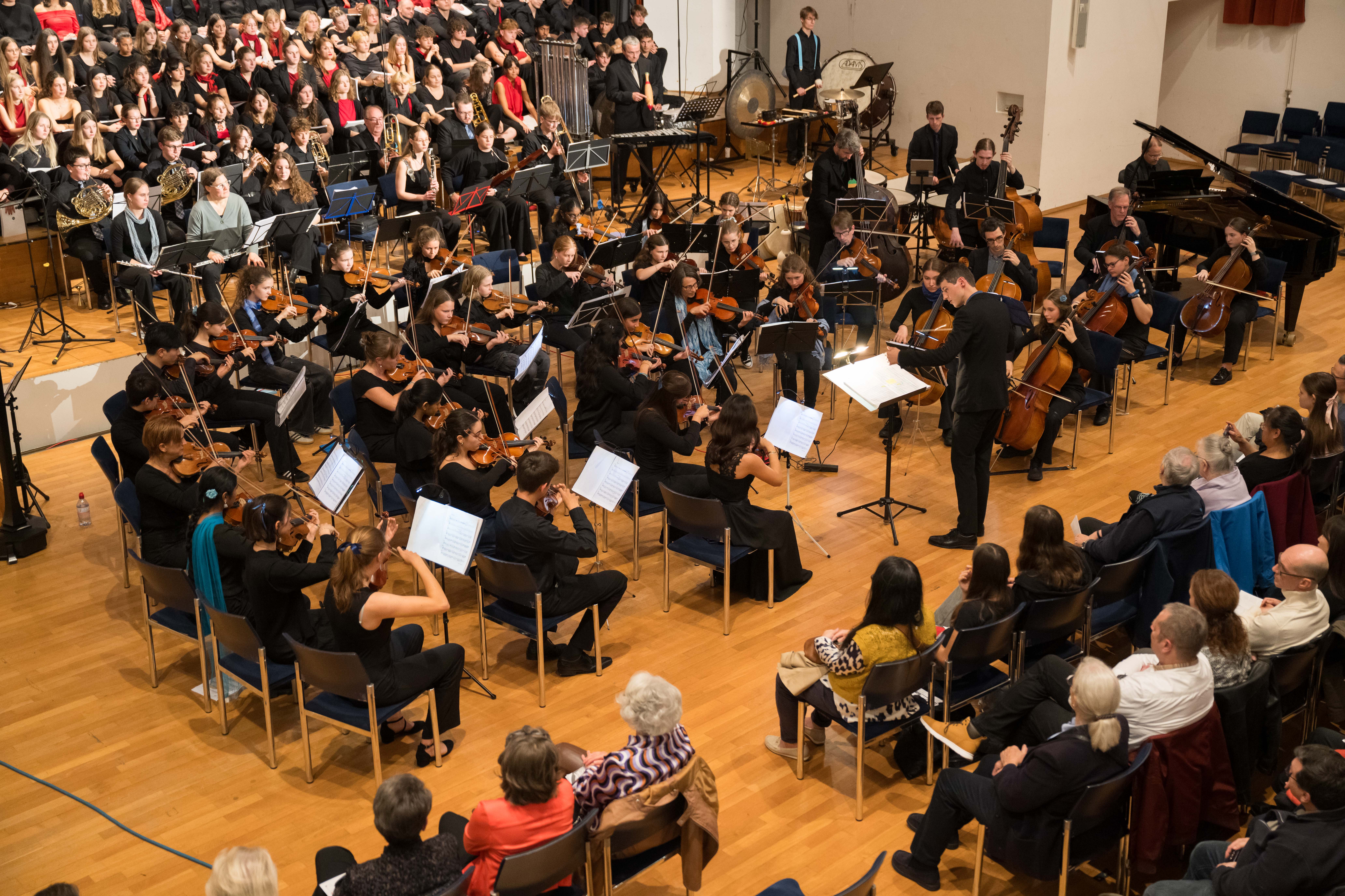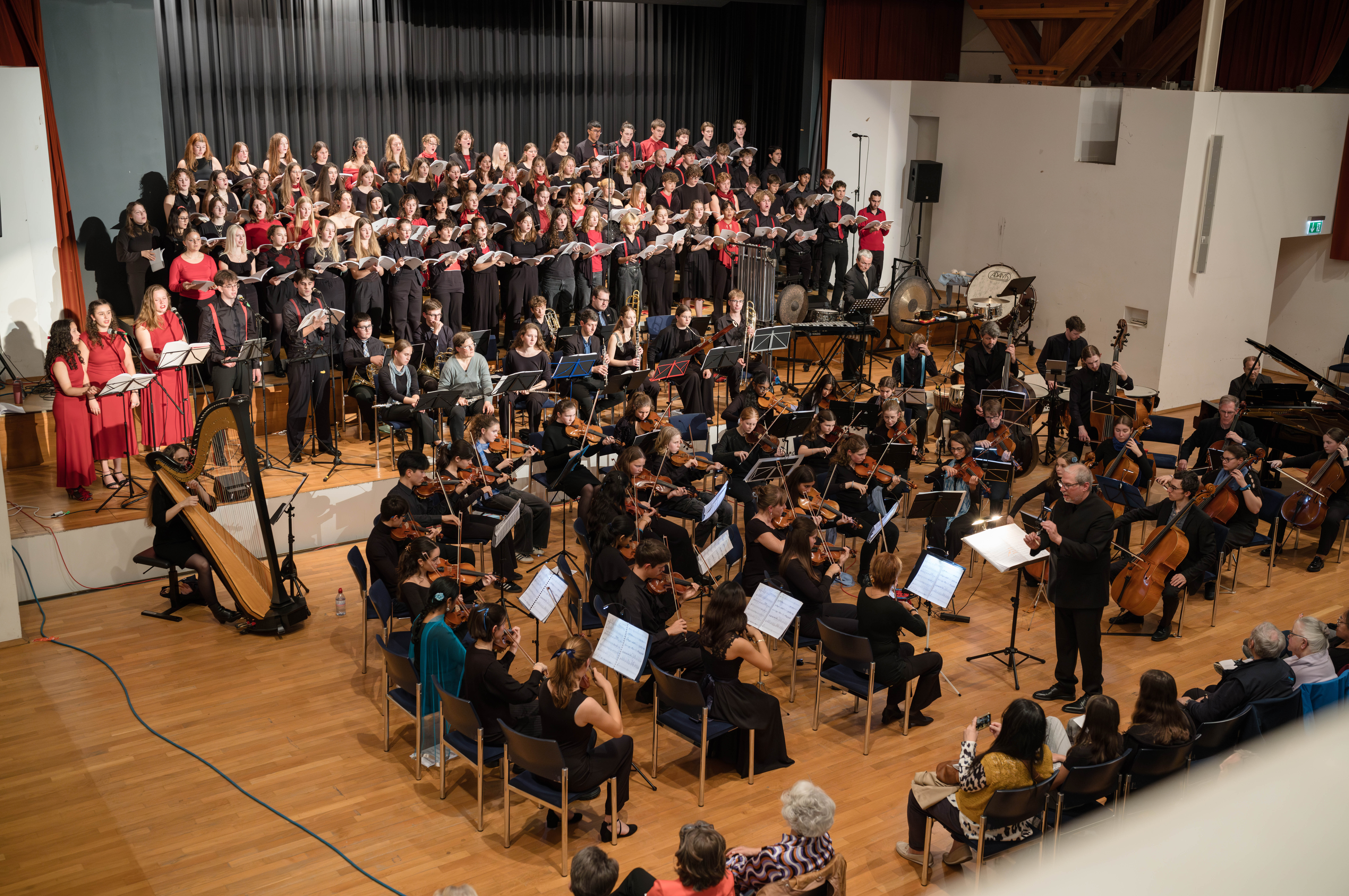 Surrende Aufregung und festliche Stimmung im grossen Saal des Gemeindezentrums Mittenza in Muttenz. Die Angehörigen, Freund*innen und Lehrkräfte der Mitglieder des Chors des Gymnasiums Muttenz und der Jungen Birsphilharmonie, des Orchesters der Musikschulen des Kantons Basel-Landschaft, freuen sich auf das Konzert. Und sie spenden begeisterten Applaus, als sich der Chor aufstellt und das stolze Orchester erscheint. Von Ines Lilian Siegfried (Fotos: Daniel Nussbaumer)