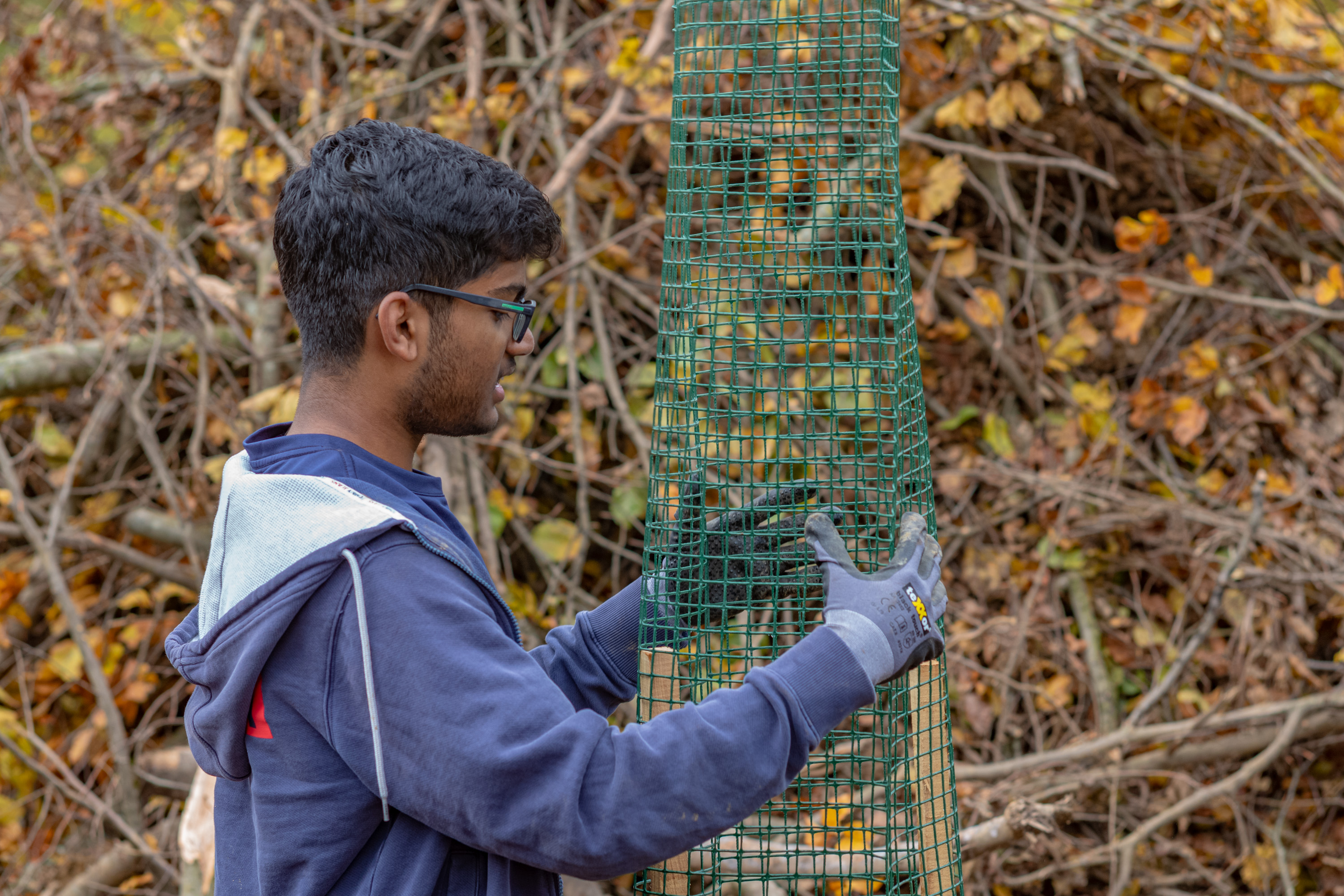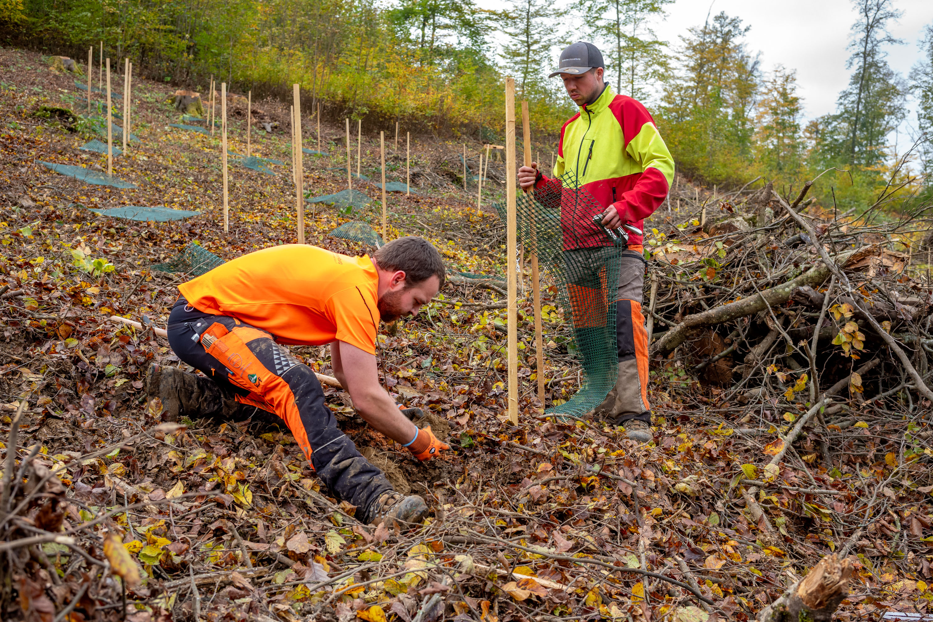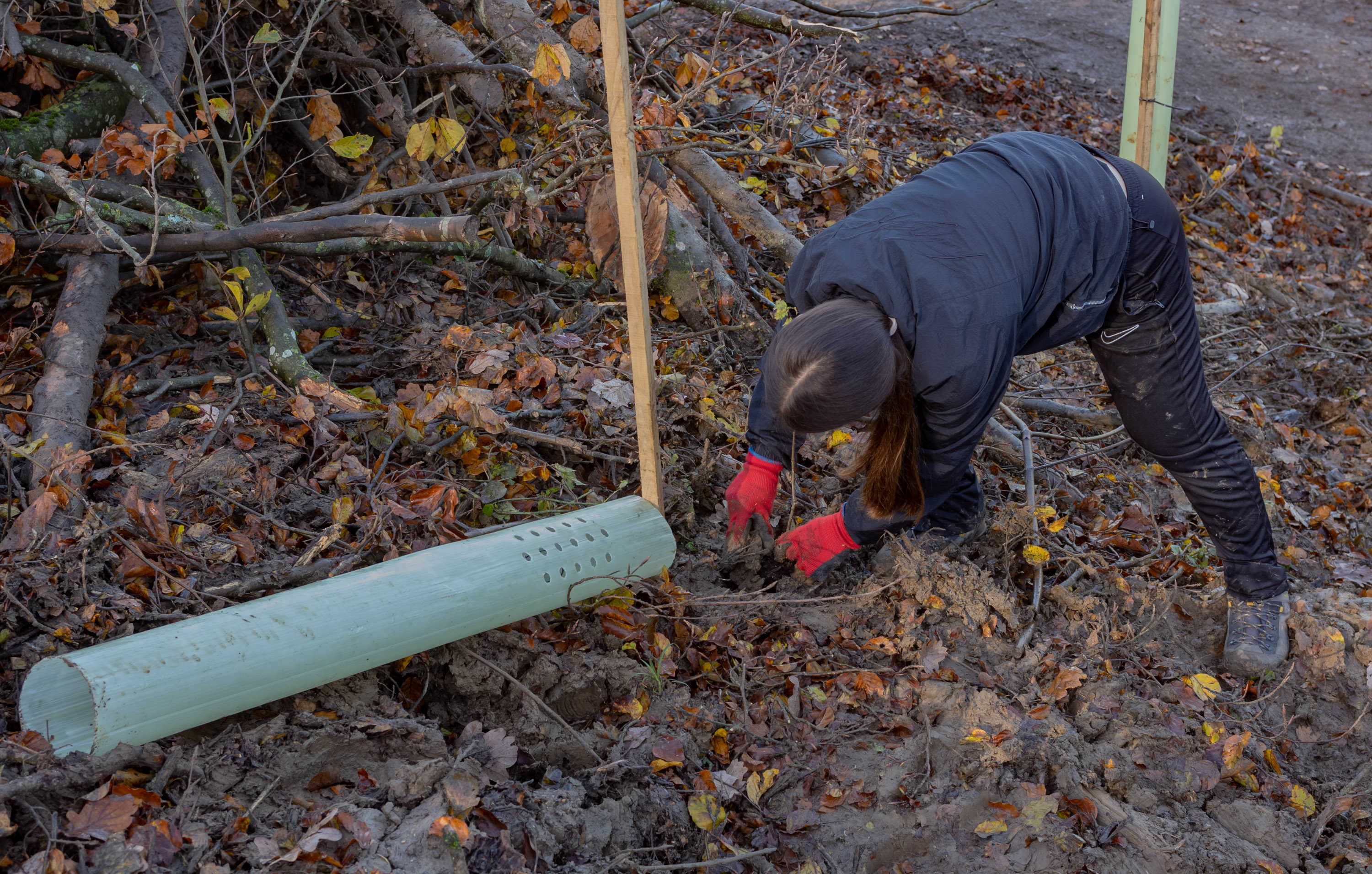 Damit das Wild die Setzlinge nicht anknabbert, müssen sie geschützt werden. Wir setzten je nach Baumart ein bis zwei Pfähle neben die Setzlinge. Bei den Eichen stülpten wir ein Kunststoffrohr darüber, bei der Schwarznuss und den Föhren war es ein Netz, das die Setzlinge schützt. Das Kunststoffrohr bzw. das Netz wurde mit Kabelbindern an den Pfählen fixiert.