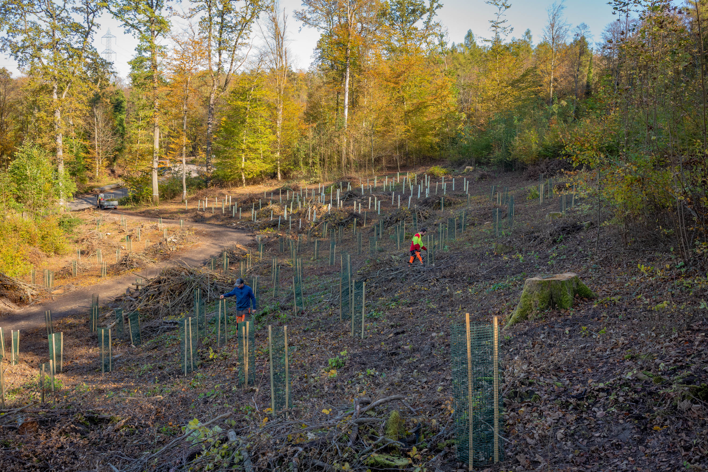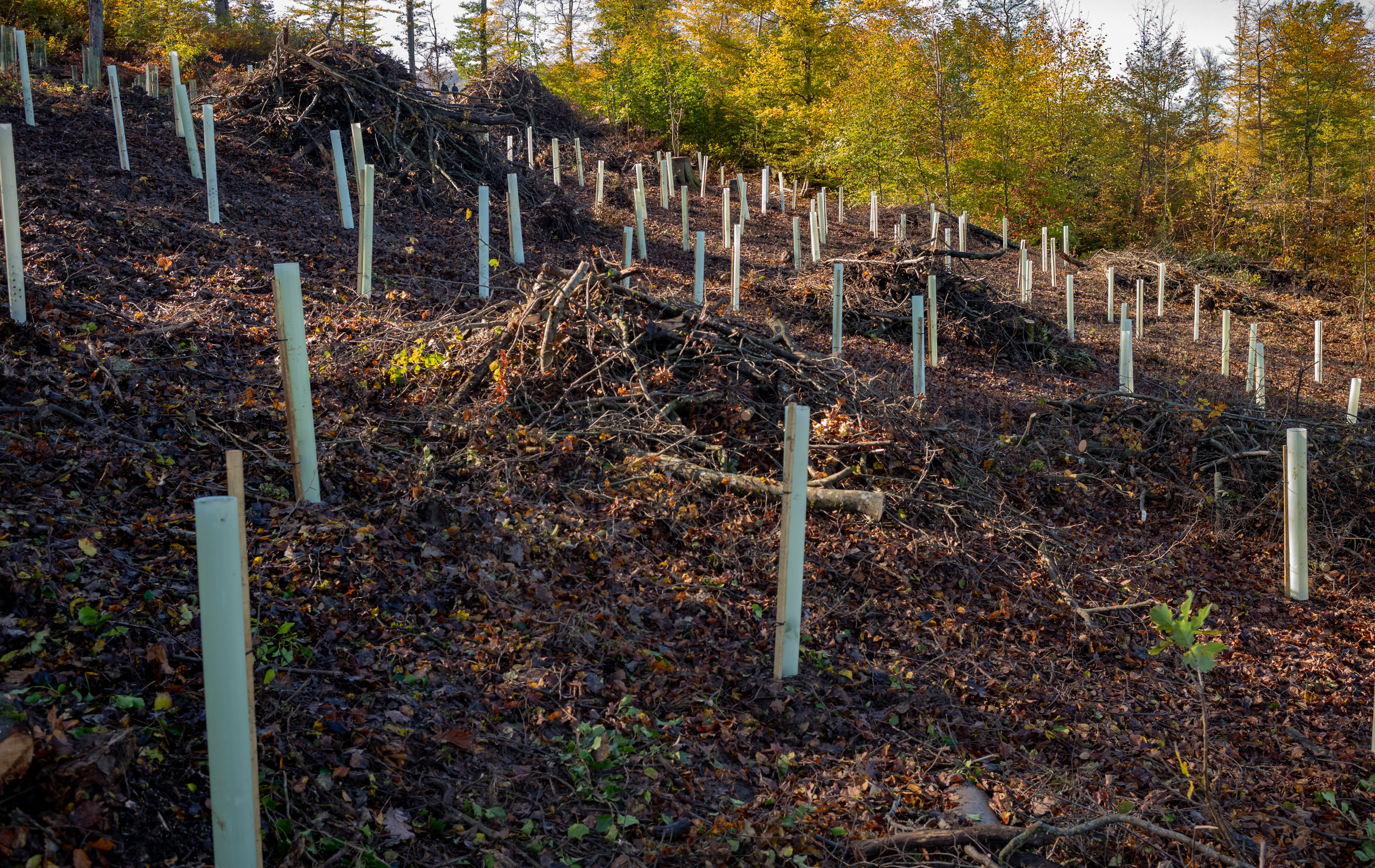 Mit Stolz blickten wir auf die Pflanzfläche. Wo vor kurzem noch von eingeschleppten Krankheiten und vom Klimawandel gestresste Bäume standen, gedeihen jetzt an Hitze und Trockenheit angepasste Arten.