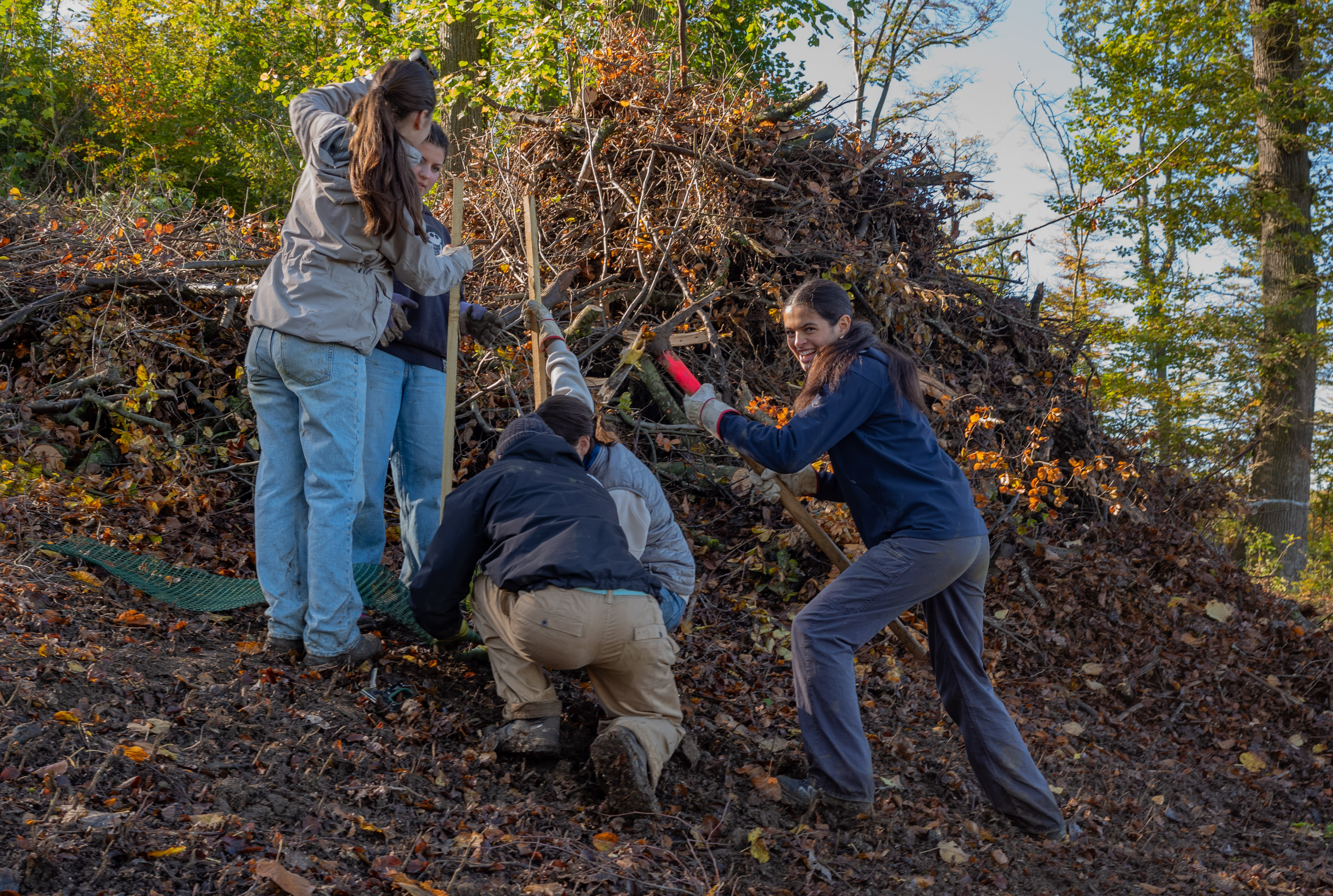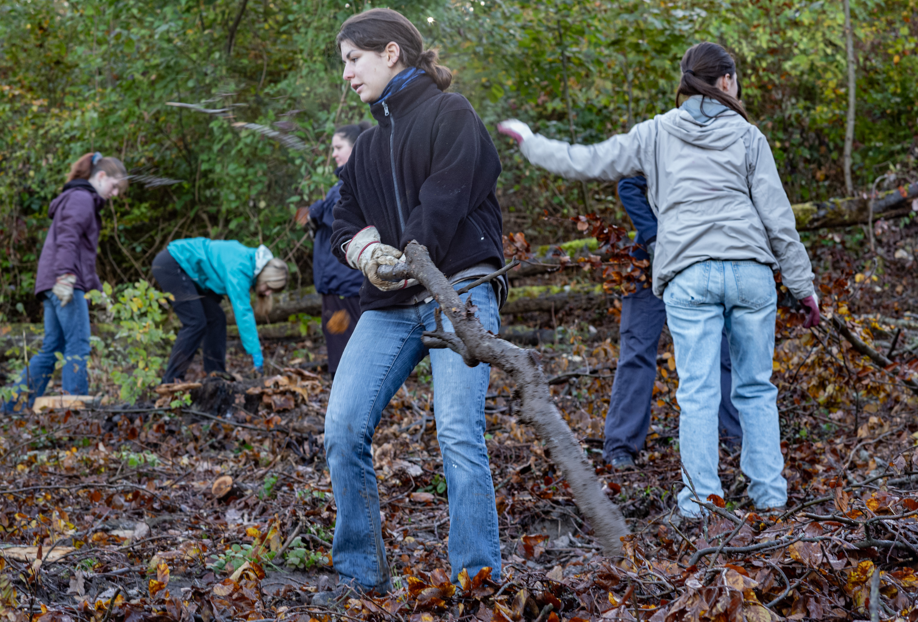 Zuerst musste der «Schlag» für die Baumpflanzung vorbereitet werden. Dabei galt es den Pflanzplatz von liegengebliebenen Stämmchen und Ästen zu befreien. Die entstandenen Asthaufen dienen Waldtieren als Unterschlupf. Diese Arbeit im schlammig rutschigen Gelände war schweisstreibend und wir wurden von Kopf bis Fuss schmutzig und nass.