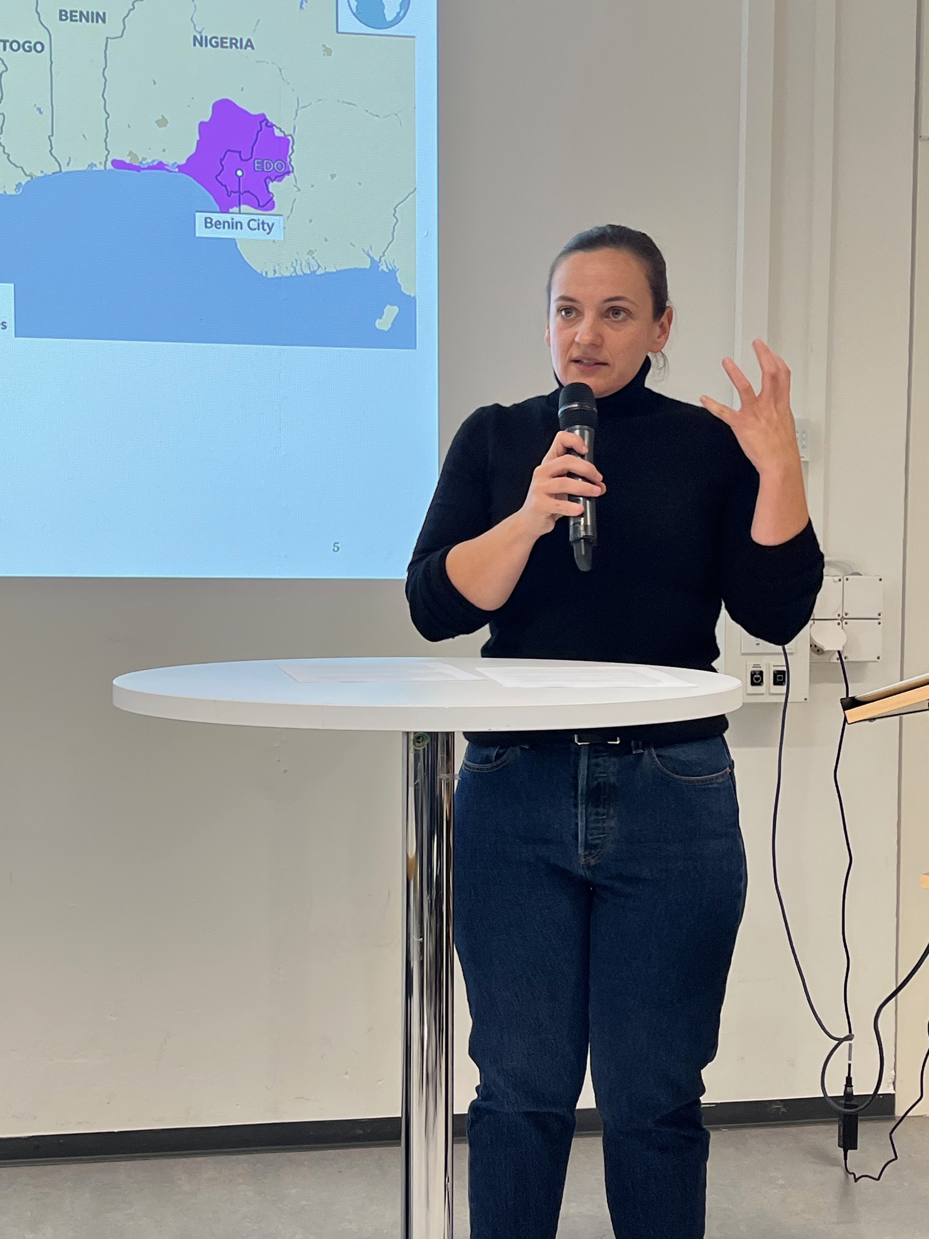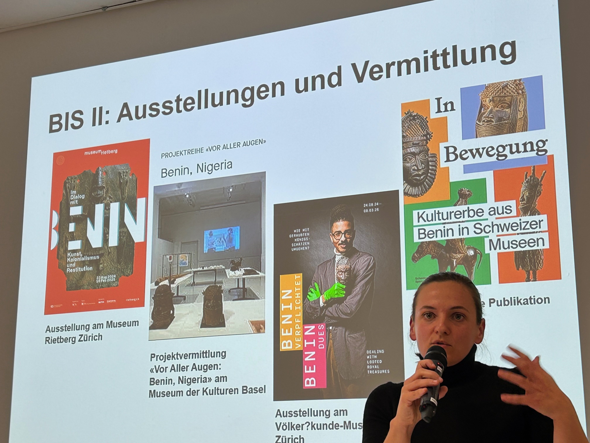 Die Referentinnen erläuterten, wie nach der Eroberung Benins durch Grossbritannien der Königspalast des Oba 1897 geplündert wurde und nicht wenige Objekte über Grossbritannien den Weg in die Schweiz und nach Basel fanden. Im Rahmen der Benin Initiative Schweiz wurden auch 21 Objekte in der Sammlung des Museums der Kulturen untersucht. Das Archiv, Karteikarten und Inventarbücher führten unter anderem zum Sammler und Händler William Webster und zur Antwort, dass 16 dieser «Benin Bronzen» aus dem Königreich Benin unrechtmässig entwendet worden waren. Somit wurde auch die Schweiz Teil eines kolonialen Geflechts.