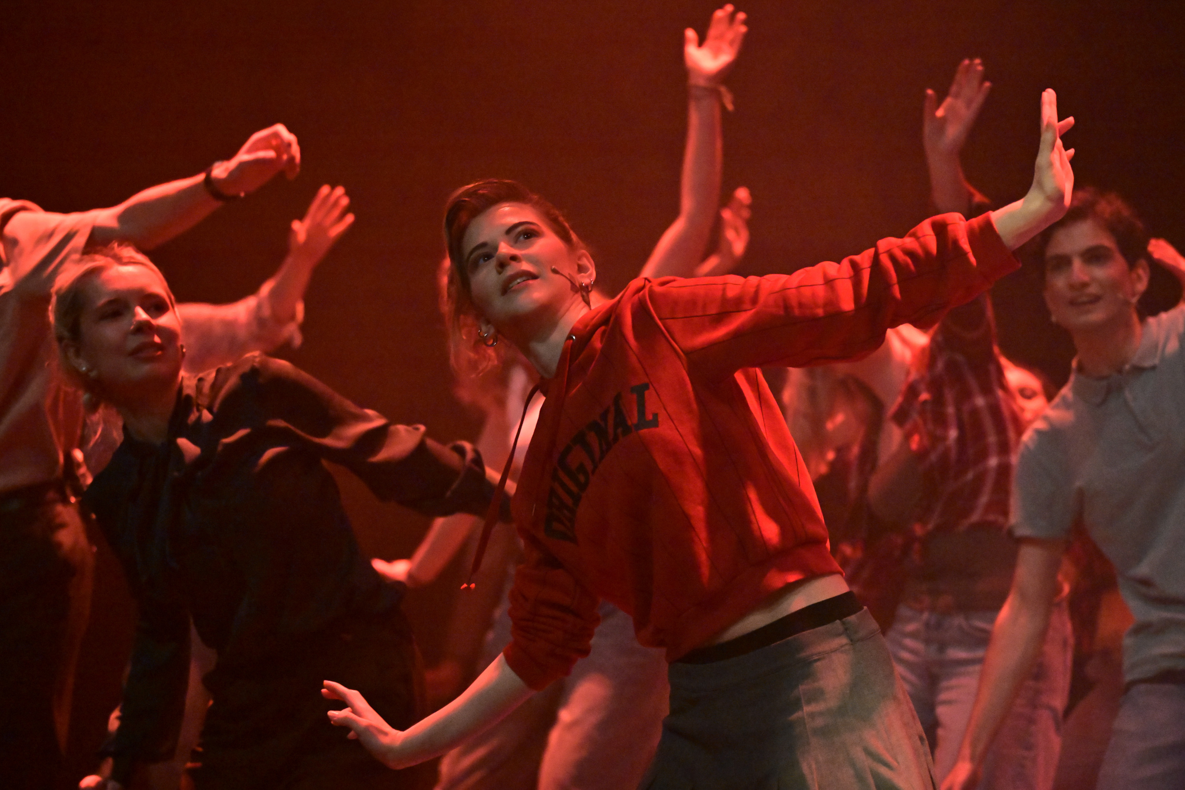 Die Inszenierung von Karolina Kowalska und Franziska Baumgartner kann diese Stereotype nicht brechen, allein schon weil die Songs eben die Songs sind, die gesungen werden müssen. Aber sie kann diese Vorgänge und Rollen reflektieren und mit einem Genderswitch in der Hauptrolle des Ren McCormack zumindest hinterfragen: Vanessa Häusler eignet sich diese ursprünglich männliche Rolle wie selbstverständlich an und wächst sicht- und hörbar daran im Verlauf der Performance. Sie bringt das in Bomont herrschende Tanzverbot des Reverend Moore zu Fall. Denn in Bomont steht alles still, Ren jedoch, aus der Grossstadt Chicago mit alleinerziehender Mutter hergezogen, kann das nicht: „I Can’t Stand Still.“ Sie muss aber aufpassen, denn „Somebody’s Eyes“ beobachten sie bei jedem Tanzschritt.