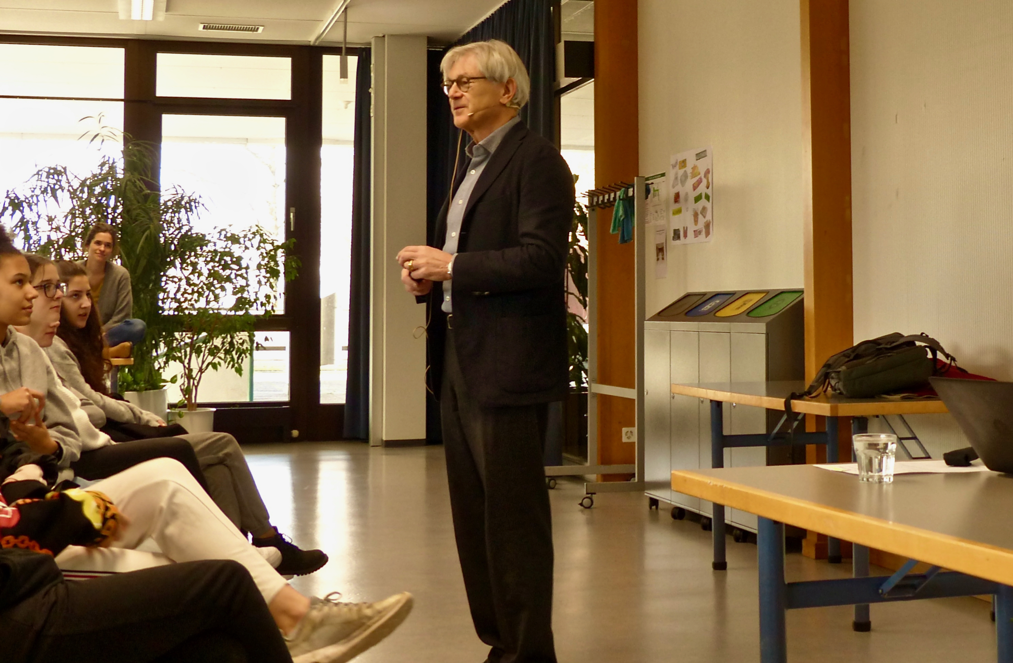 Professor Wolf Langewitz nimmt im Rahmen einer Mittagsveranstaltung der Kulturkommission die 140 anwesenden Schülerinnen und Schüler der FMS- und Maturabteilung mit auf eine spannende Reise zum Thema «Placebo – Nocebo».