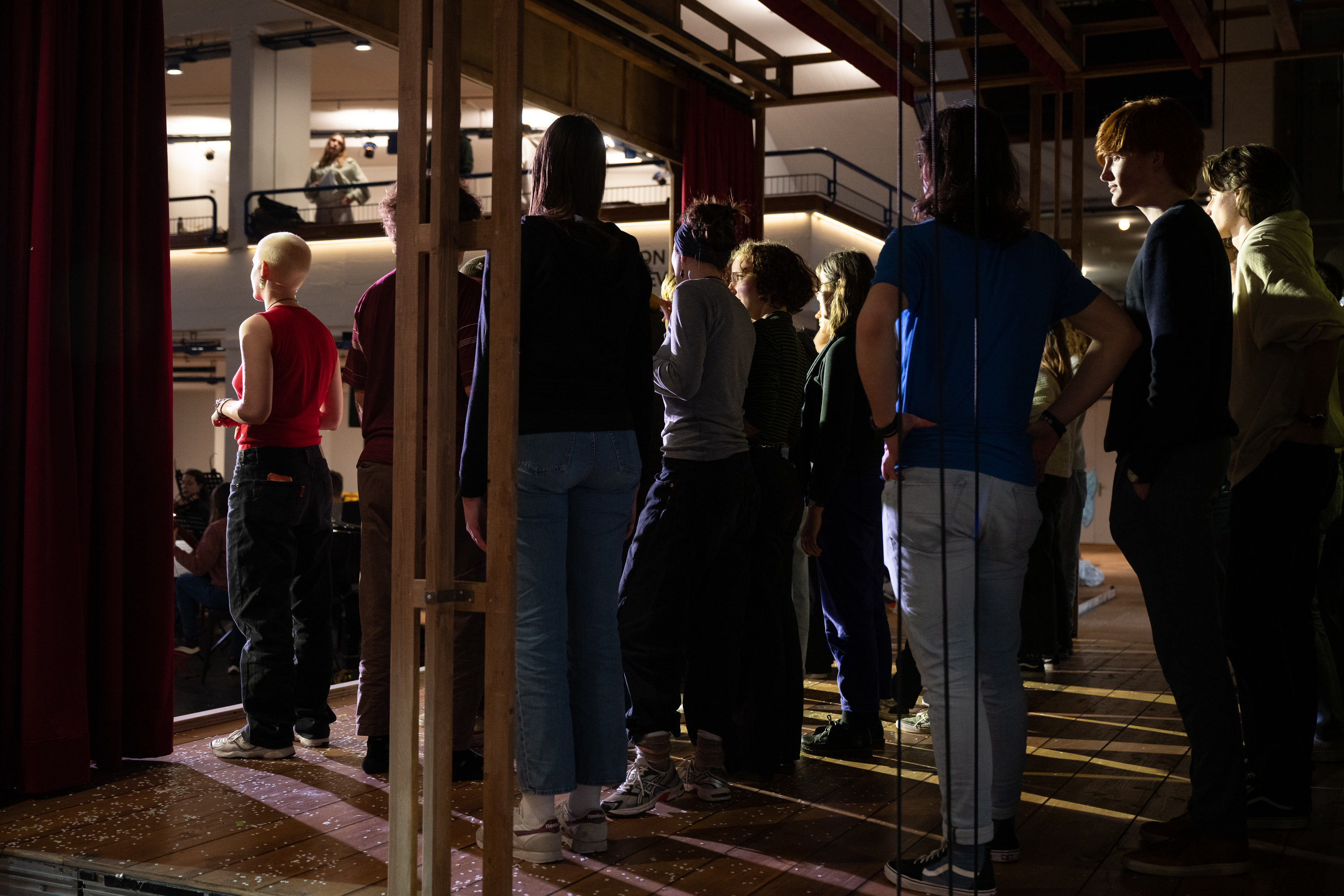 Es war kurz vor halb eins. Dutzende Zuschauer:innen strömten in das bestuhlte Foyer. Einige stillten noch hastig ihren Hunger, bevor die Vorstellung begann. Einige der Stühle waren reserviert. Daran hingen Schilder mit der Aufschrift «Klasse F2a» und «Klasse F2e». Hier sassen die Schauspieler:innen, die einen gekleidet in Anzügen, die anderen in altmodischen Ballkleidern, wieder andere in Alltagskleidung. Als alle aufstanden und auf der Bühne herumgingen, erinnerte die Szene an eine Party, was durch die laute Musik noch stärker unterstrichen wurde.