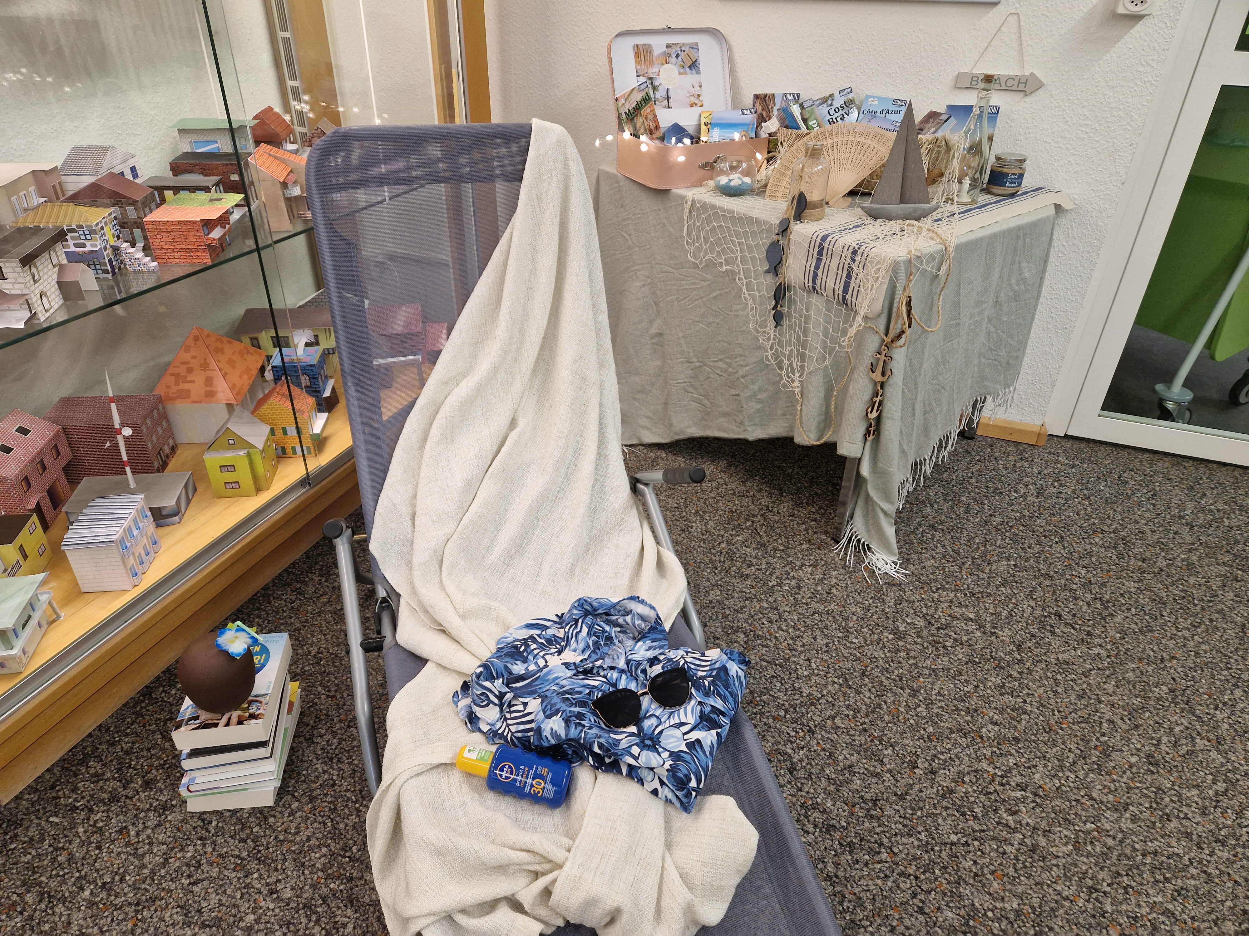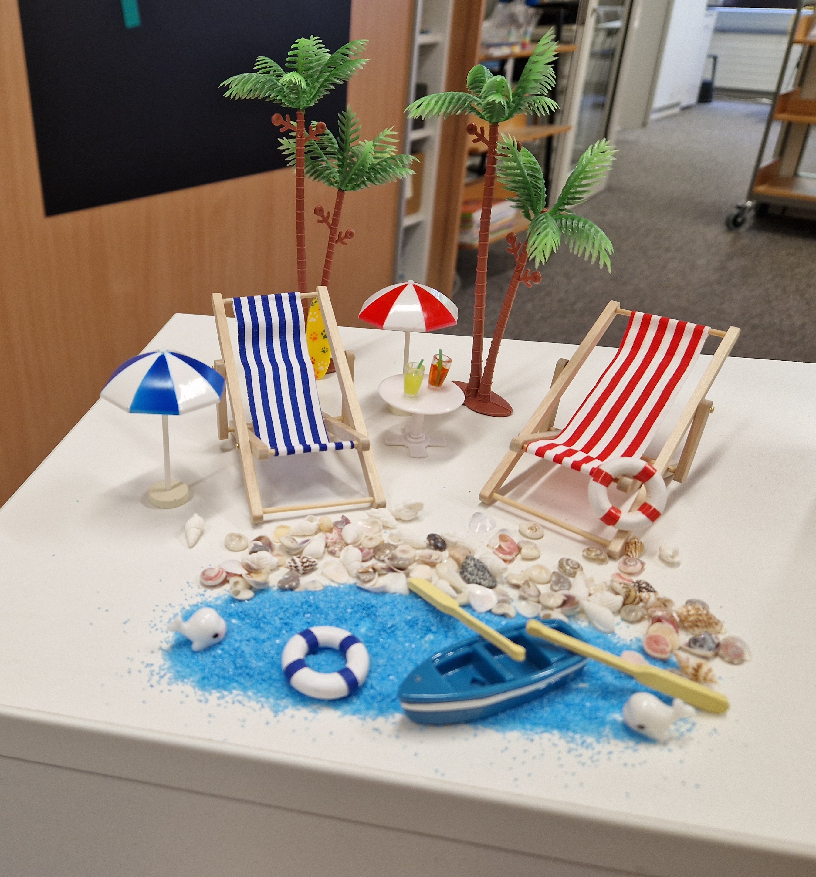 Es scheint noch nicht eine sommerliche Stimmung zu herrschen. Die letzten Prüfungen sind nahe und das Wetter zeigt sich mehr nass und grau als sonnig und warm. Wir haben aber beschlossen das es jetzt Zeit wird für den Sommer und wir möchten zumindest in der Mediothek eine sommerliche Stimmung erzeugen.