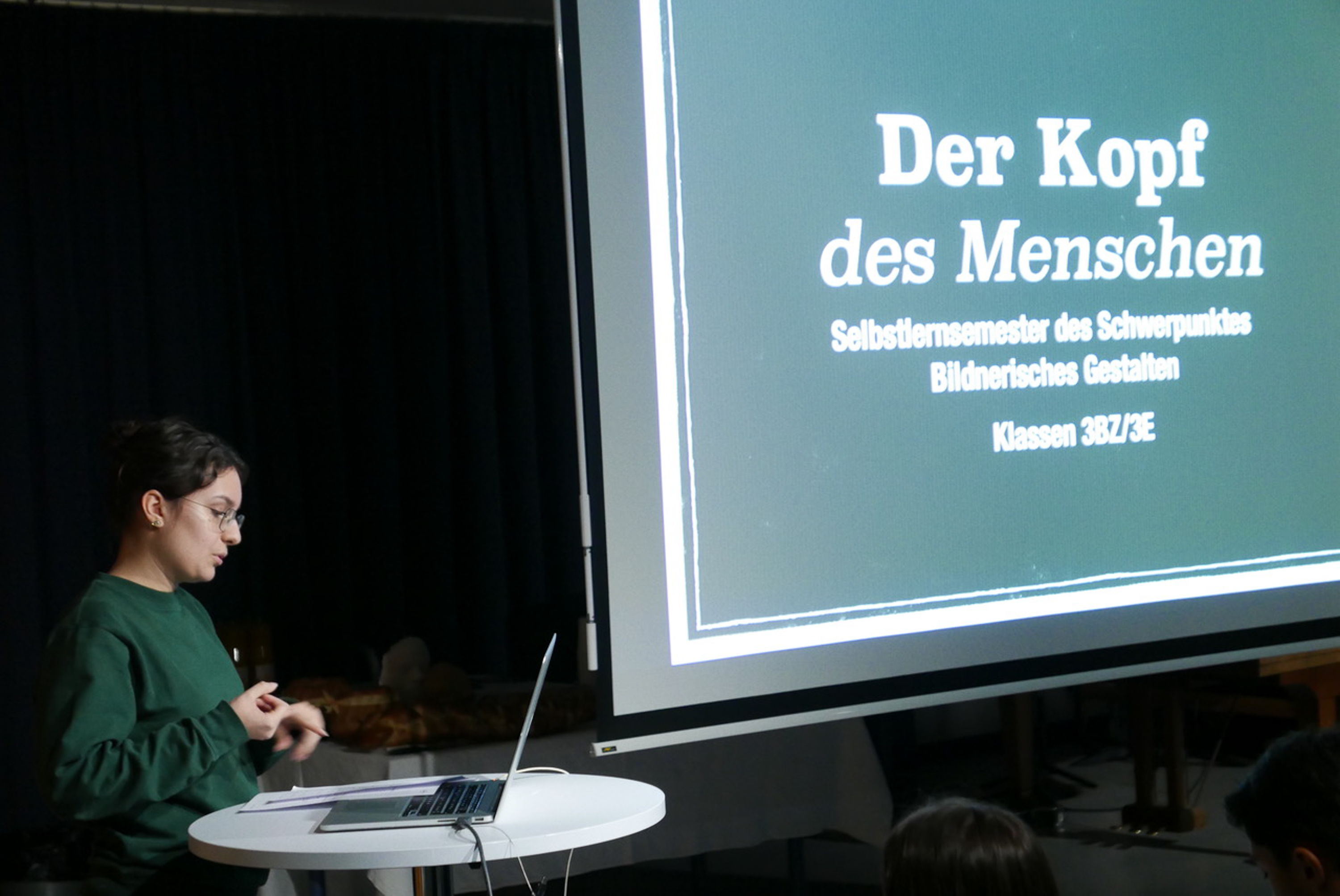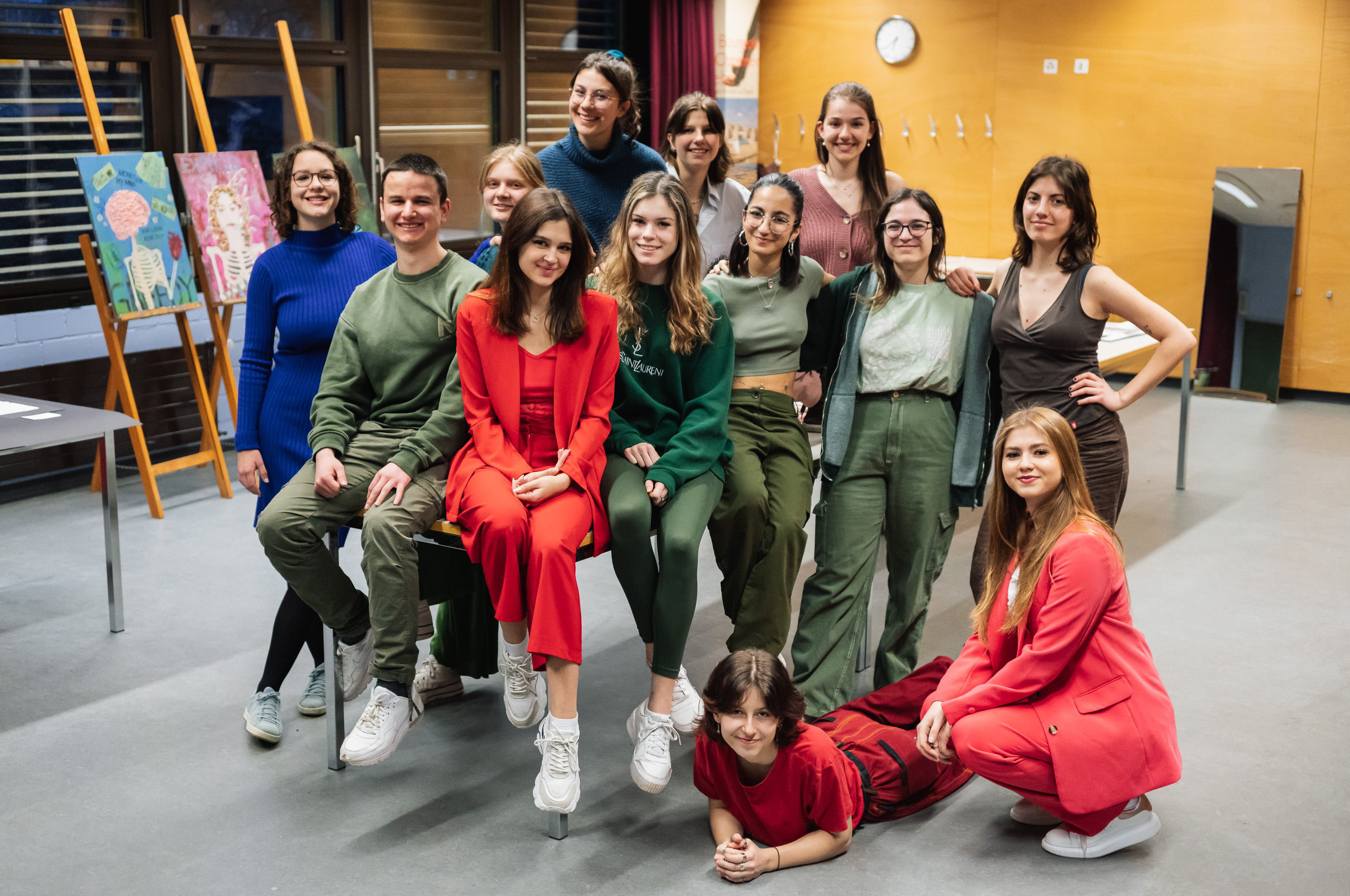 Ein buntes Treiben herrscht im Foyer des Gymnasiums Muttenz. Grün, grün, grün sind alle unsere Kleider, grün, grün, grün ist alles, was wir haben. Vor lauter Bäumen sehen wir den Wald nicht mehr. Doch da! Ein roter Farbklecks inmitten der Klasse 3MZ. Ist es das Rotkäppchen? Nein es sind Rafete und Noemi, die den Abend mit einem Sketch eröffnen. Ohne das Blaue vom Himmel zu versprechen, kündigt Rafete ein wunderbares, harmonisches, melodisches, musikalisches, akkordeon(isches) Stück an, welches Elina vortragen wird. Ein bunter Haufen sind wir, die 3MZ, und genau so wird auch unser Abend zum Selbstlernsemester (SLS) – vielseitig und aufregend! Das Publikum schwärmt aus, um die künstlerischen Arbeiten zum Thema Metamorphose zu bestaunen und den selbst verfassten Texten der Schülerinnen und Schüler zu lauschen.